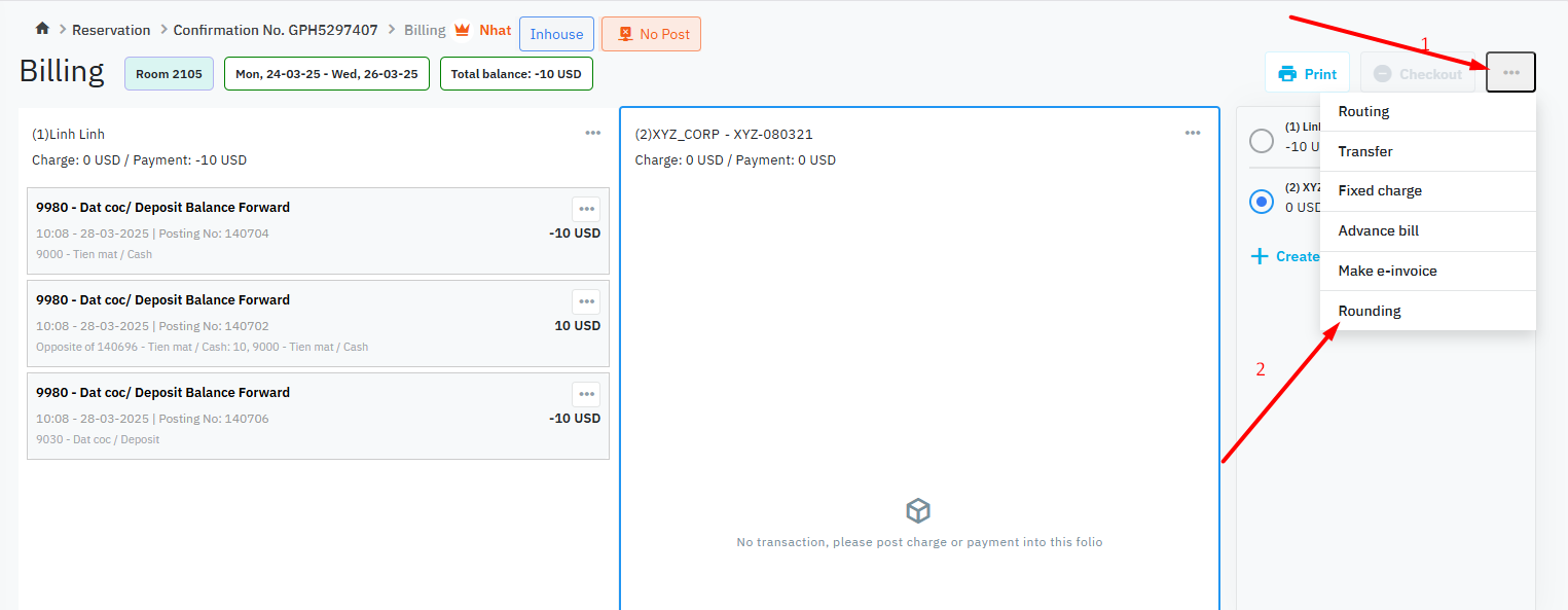 Log in - Front Office - Reservation - ជ្រើសរើសកក់បន្ទប់ - ចុចលើរូបតំណាង “Go to Billing” - ជ្រើស “Rounding”![]()