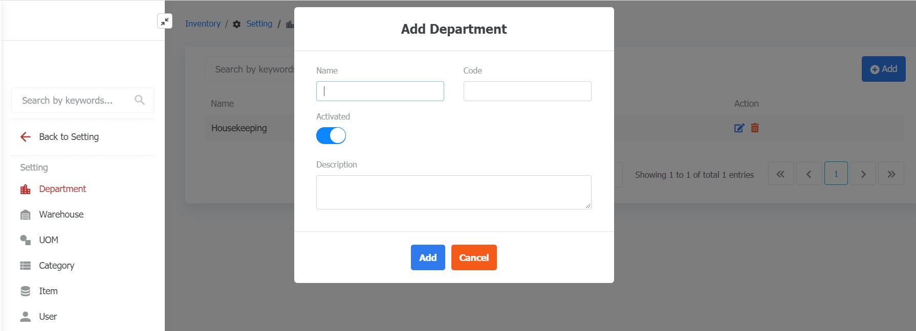 អនុញ្ញាតឱ្យបង្កើត និងគ្រប់គ្រងនាយកដ្ឋាននៅក្នុងសណ្ឋាគារ, គោលបំណងគឺគ្រប់គ្រងឃ្លាំងតាមផ្នែកនាយកដ្ឋាន វាតម្រូវឱ្យឃ្លាំងមួយត្រូវតែជាក់លាក់ជារបស់ Department ណាមួយ, គួរតែសម្រាប់ករណីឃ្លាំងទូទៅឬឃ្លាំងប្រើរួមនឹងអាចបង្កើត Department នទូទៅ (ឧទាហរណ៍ General Department) |