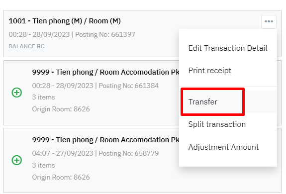 Log in – Front Office – Reservation – ជ្រើសរើសការកក់ – ចុចរូបតំណាង “Billing” – ក្នុងព័ត៌មានលម្អិត folio – ចុច “…“ – ជ្រើសរើស “Transfer” |