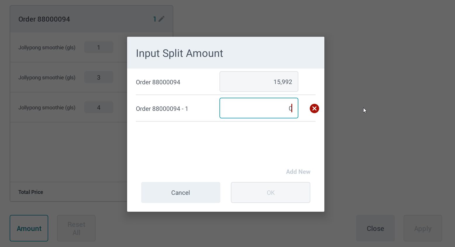 ![]() រាល់ប៊ូតុងមុខងារប្រតិបត្តិការ split មុខម្ហូប : ![]() (1) Mark All : ជ្រើសរើសមុខម្ហូបទាំងអស់តាម bill ចាស់ ( ចំណាំ : ចុចដើម្បីជ្រើសរើសម្ហូបមុន 1មុខ ) (2) Share item: ចែកចំនួនទ្វេមុខម្ហូបសម្រាប់ការបញ្ជាទិញថ្មី ( ឧទាហរណ៍ : ចំនួនមុខម្ហូបគឺ 4 ហើយនឹងបែងចែកជា 2 ការបញ្ជាទិញចាស់ និង 2 ការបញ្ជាទិញថ្មី។ ) (3) Reset All : លុបប្រតិបត្តិការបន្ថែមទាំងអស់នៅលើអេក្រង់ Split Item នេះ (4) Undo Split : ត្រឡប់ទៅប្រតិបត្តិការមុន 3/Split Amount : បំបែកទឹកប្រាក់ bill នៅពេលអនុវត្តសូមជ្រើសរើស Amount បញ្ចូលចំនួនទឹកប្រាក់ដើម្បីបំបែក bill និង click Apply ![]() |