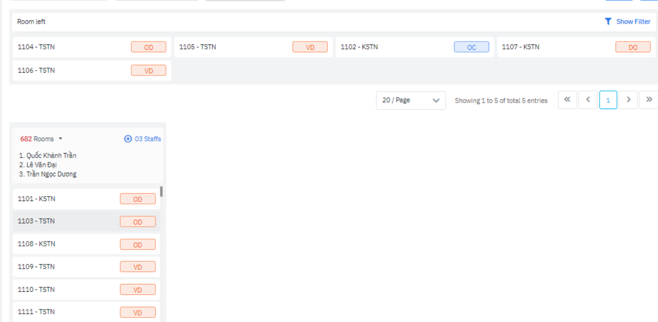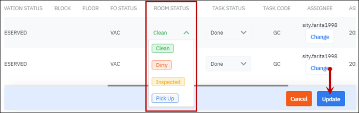 ធ្វើបច្ចុប្បន្នភាពស្ថានភាពនៃកាលវិភាគសម្អាតសម្រាប់បុគ្គលិកម្នាក់ៗ ជំហាន 1: ចុចលើឈ្មោះបុគ្គលិកផ្នែកសម្អាតបន្ទប់ ប្រព័ន្ធបង្ហាញបញ្ជីលេខបន្ទប់លម្អិតនៅលើកាលវិភាគសម្អាតរបស់បុគ្គលិក ![]() ជំហាន 2: នៅជួរ “Task Status” ចុចលើសញ្ញាព្រួញដើម្បីធ្វើបច្ចុប្បន្នភាពស្ថានភាពកាលវិភាគសម្អាតបន្ទប់នោះ។ ជំហាន 3: ចុច “Update” ដើម្បីរក្សាទុកព័ត៌មានដែលទើបតែបញ្ចូល. ធ្វើបច្ចុប្បន្នភាពស្ថានភាពបន្ទប់ ជាមួយនឹងបន្ទប់ត្រូវបានសម្អាតរួច (កាលវិភាគសម្អាតមានស្ថានភាពគឺ Done), អ្នកប្រើប្រាស់អាចធ្វើបច្ចុប្បន្នភាពស្ថានភាពបន្ទប់ ជំហាន 1: ចុចលើឈ្មោះបុគ្គលិកផ្នែកសម្អាត. ប្រព័ន្ធបង្ហាញបញ្ជីលេខបន្ទប់លម្អិតនៅលើកាលវិភាគសម្អាតបន្ទប់របស់បុគ្គលិក ជំហាន 2: នៅជួរ “Room Status” ចុចលើសញ្ញាព្រួញដើម្បីធ្វើបច្ចុប្បន្នភាពស្ថានភាពនៃបន្ទប់នោះ ជំហាន 3: ចុច “Update” ដើម្បីរក្សាទុកព័ត៌មានដែលអ្នកទើបតែបញ្ចូល ![]() |