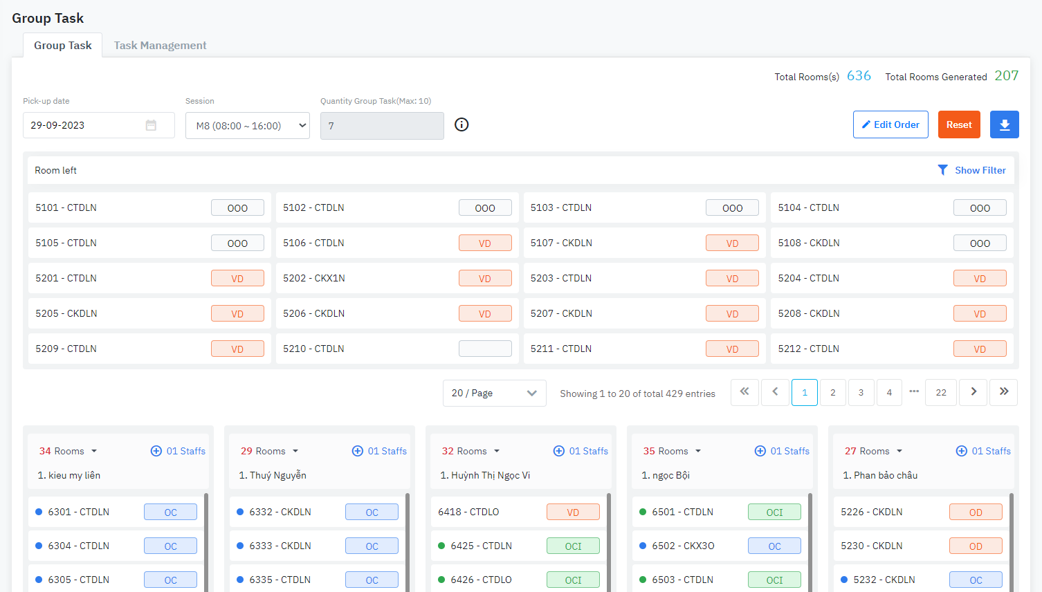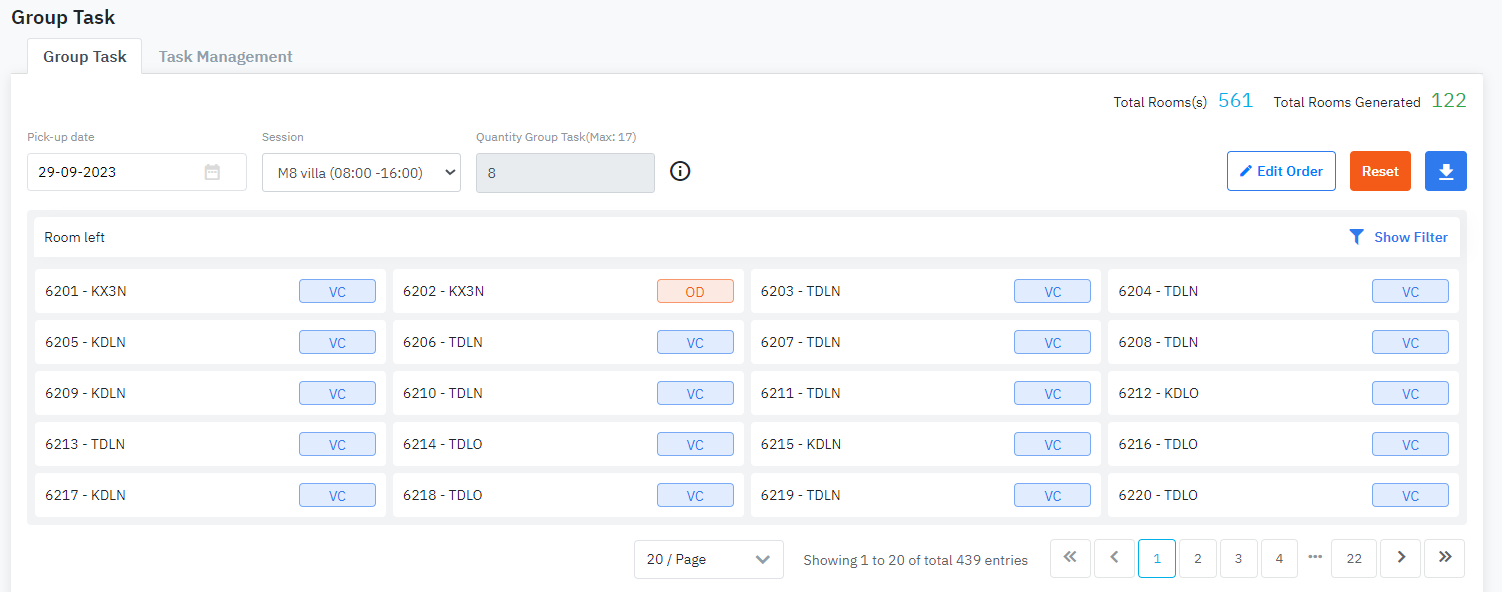 [Result] – លទ្ធផលស្វែងរក ![]() ជំហាន 3: បញ្ចូលចំនួនកាលវិភាគសម្អាតដែលចង់បង្កើតនៅក្នុងវាល “Quantity Group Task” និងចុច “Generate”. ប្រព័ន្ធនឹងស្វ័យប្រវត្តិបង្កើតកាលវិភាគសម្អាតដែលត្រូវគ្នាតាមបរិមាណដែលបានបញ្ចូល។ រាល់បន្ទប់នឹងត្រូវបានយកតាមលេខ លំដាប់ទាបទៅខ្ពស់. ចំនួនបន្ទប់សម្រាប់កាលវិភាគសម្អាតនីមួយៗត្រូវបានគណនាដូចក្នុងឧទាហរណ៍ខាងក្រោម VD: បាទសរុប 17 បន្ទប់និងបំបែកជា 3 កាលវិភាគសំអាត កាលវិភាគ 1 = round(17/3,0) = 6 កាលវិភាគ 2 = round(17/3,0) = 6 កាលវិភាគ 3 = 17 – កាលវិភាគ 1 – កាលវិភាគ 2 = 5 ![]() ![]() អ្នកប្រើប្រាស់អាចអូស និងទម្លាក់បន្ទប់ទៅវិញទៅមករវាងកាលវិភាគសម្អាត ជំហាន 4: ចុចលើសញ្ញាព្រួញដើម្បីជ្រើសរើសបុគ្គលិកដែលបានប្រគល់ឱ្យក្រុមភារកិច្ច stickដើម្បីចាត់តាំង អាច stick បុគ្គលិកច្រើន។ ![]() ជំហាន 5: កាលវិភាគសម្អាតដែលត្រូវបានប្រគល់ឱ្យបុគ្គលិកនឹងត្រូវផ្ទេរទៅ tab Task Management. ![]() រាល់មុខងារ ![]()