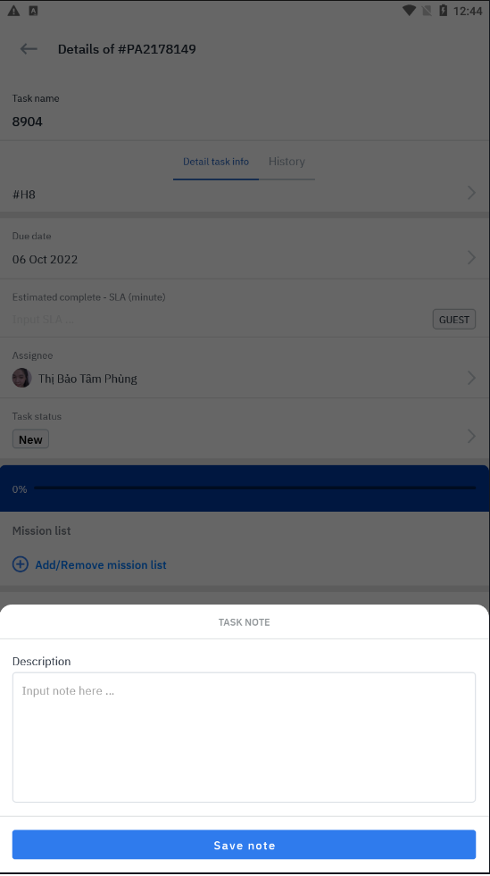 រាល់ផ្លាស់ប្ដូរណាមួយនៅ Task Detail នឹងត្រូវបានរក្សាទុកដោយស្វ័យប្រវត្តិ. Role manager នឹងត្រូវបានផ្លាស់ប្តូរច្រើនព័ត៌មានអាស្រ័យលើការអនុញ្ញាត | ![]() បញ្ជូល note សម្រាប់ task ឬអាចទាញរូបភាពឡើងដើម្បីធ្វើកំណត់ចំណាំនៅលើរូបភាពសម្រាប់ជួយអន្តរកម្មកាន់តែប្រសើរឡើងរវាងផ្នែក ![]() |