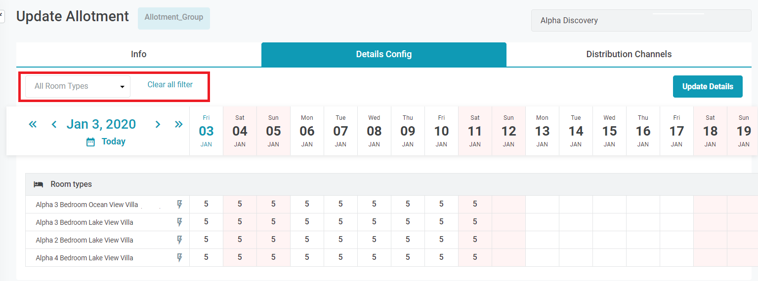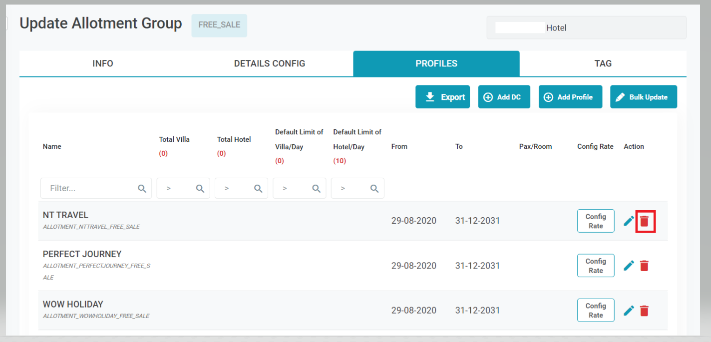 2.2. តារាងលទ្ធផល៖ បង្ហាញបញ្ជីលម្អិតនៃចំនួនបន្ទប់លក់តាមថ្ងៃ និងប្រភេទបន្ទប់ដែលបានប្រកាសកម្មវិធីគាំទ្រការត្រងទិន្នន័យតាមបន្ទប់ដើម្បីជួយសម្រួលដល់ការស្វែងរកអ្នកប្រើប្រាស់ ជ្រើស Clear all filter ដើម្បីលុបទិន្នន័យទាំងអស់ដែលត្រងមុននឹង ![]() 3. [Tab Profile] – បណ្តាញលក់បន្ទប់របស់ក្រុម Alloment3.1 Add DC / Add Profile ចូលក្រុមមូលនិធិ3.1.1. ប្រកាសបណ្តាញលក់បន្ទប់ដែលអនុវត្តសម្រាប់ក្រុមមូលនិធិបន្ទប់ ចុច “Add DC” ដើម្បីបន្ថែមបណ្តាញលក់បន្ទប់![]() ![]() អាចស្វែងរកតាមពាក្យគន្លឹះ/ត្រងតាមកាត 3.1.2. ប្រកាសប្រវត្តិរូបភ្នាក់ងារដែលអនុវត្តសម្រាប់ក្រុមមូលនិធិបន្ទប់។ ចុច “Add Profile” ដើម្បីបន្ថែមប្រវត្តិរូបភ្នាក់ងារ![]() ![]() អាចស្វែងរកតាមពាក្យគន្លឹះ/ត្រងតាមស្លាក 3.2. បញ្ជីនៃបណ្តាញលក់បន្ទប់ដែលបានប្រកាសរបស់ក្រុមមូលនិធិបន្ទប់។វាលព័ត៌មានបង្ហាញចំនួនបន្ទប់លក់ដែលបានប្រកាសនៅ Tab Info ![]() 3.3. អនុវត្តលេខកូដតម្លៃ/ កែ/ លុបព័ត៌មាន DC នៅក្នុងក្រុមមូលនិធិ