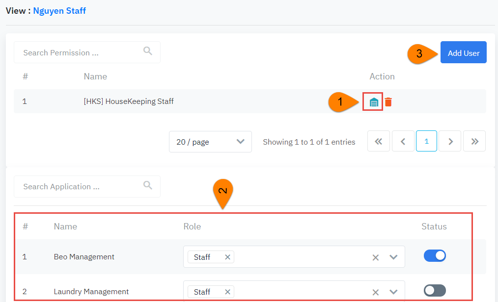 បន្ទាប់ពីការអនុវត្ត Add User ហើយជ្រើសរើសក្រុម User/ User Group, ប្រព័ន្ធនឹងបង្ហាញបញ្ជី account: ![]() Click ចូល Email User >> កម្មវិធីបង្ហាញអេក្រង់ដូចខាងក្រោម៖ ![]() (1) អនុវត្ត Add បន្ថែម Property ឱ្យ User (2) តាមលំនាំដើម មុខងារនឹងត្រូវបានបើកស្របតាមពេលបង្កើតក្រុមបែងចែកសិទ្ធិ/Group. អ្នកប្រើប្រាស់នៅតែអាចកែសម្រួល On/off រាល់លក្ខណៈគឺ User អនុញ្ញាតឱ្យប្រើប្រាស់. o បើក: User នឹងអាចមើល និងអនុវត្តបាន o បិទ: User នឹងមិនអាចមើល និងអនុវត្តបាន o នៅក្នុងផ្នែកសិទ្ធិ/Role, នឹងត្រូវបានបែងចែក 2 សិទ្ធិបុគ្គលិក/Staff និងការគ្រប់គ្រង/ Manager ![]() (3) ដើម្បីអនុវត្ត add បន្ថែម User Group ឱ្យ User >> click ចូល “Add User”, ប្រតិបត្តិការគឺស្រដៀងនឹង B1, B2, B3. ![]() |