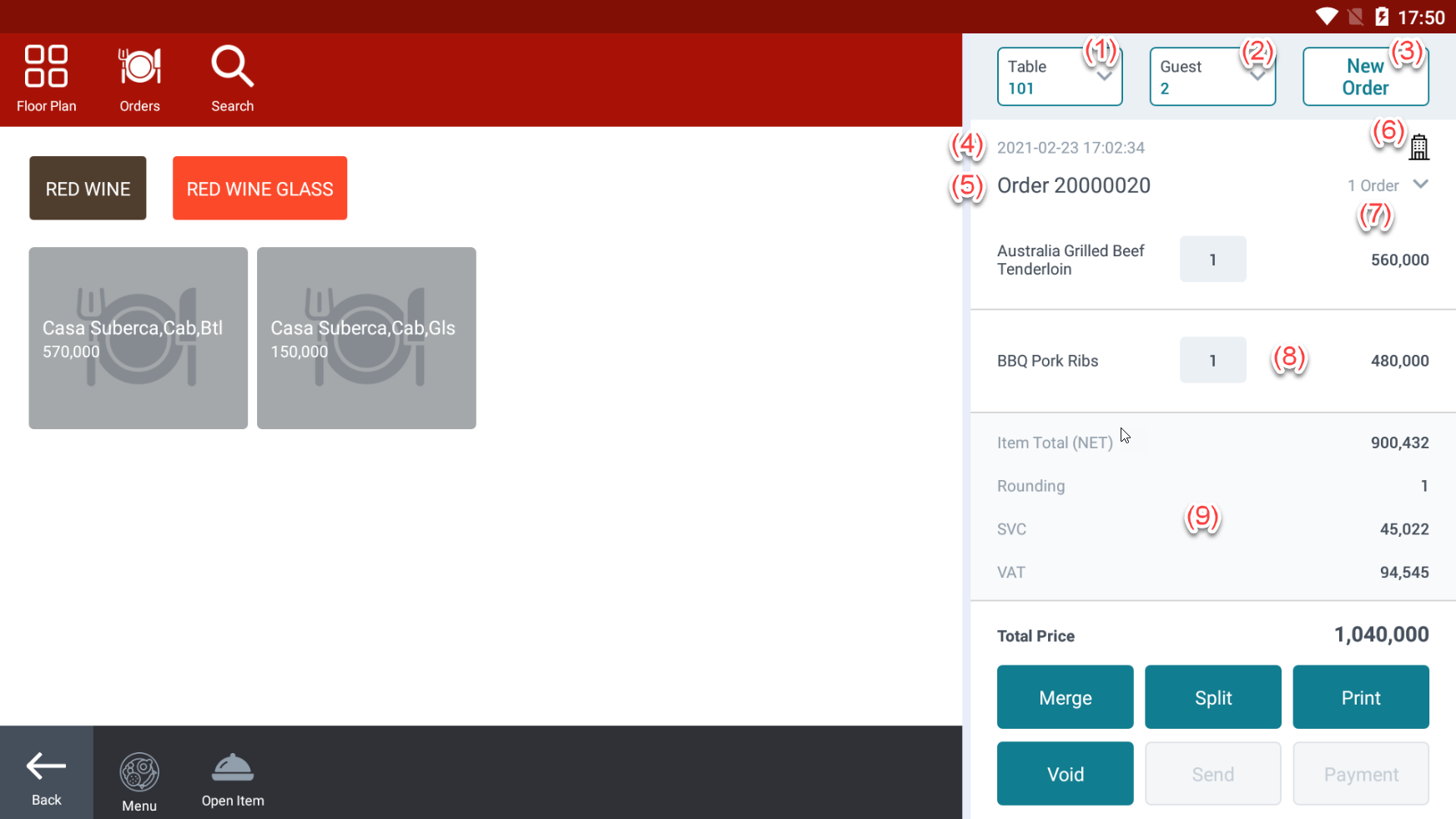 ព័ត៌មានបញ្ជាទិញ: (1) ឈ្មោះតុ, click ចូលមកដើម្បីផ្លាស់ប្តូរការបញ្ជាទិញទៅតុផ្សេង (2) ចំនួនភ្ញៀវ, click ចូលដើម្បីធ្វើបច្ចុប្បន្នភាពចំនួនភ្ញៀវ (3) បង្កើត order តុថ្មី (4) ពេលវេលាបើកតុ (5) កូដ Order (6) ព័ត៌មានភ្ញៀវ In-house, click ចូលដើម្បីមើល/ធ្វើបច្ចុប្បន្នភាព (7) ចំនួនបរិមាណ order បច្ចុប្បន្នមាននៅតុ, click បញ្ចូលដើម្បីផ្លាស់ទីទៅការបញ្ជាទិញផ្សេងទៀតនៅលើតុ (បើមាន) (8) ព័ត៌មាន items នៅក្នុងបញ្ជាទិញ (9) ព័ត៌មានតម្លៃ,ថ្លៃសេវា, ពន្ធ,… |