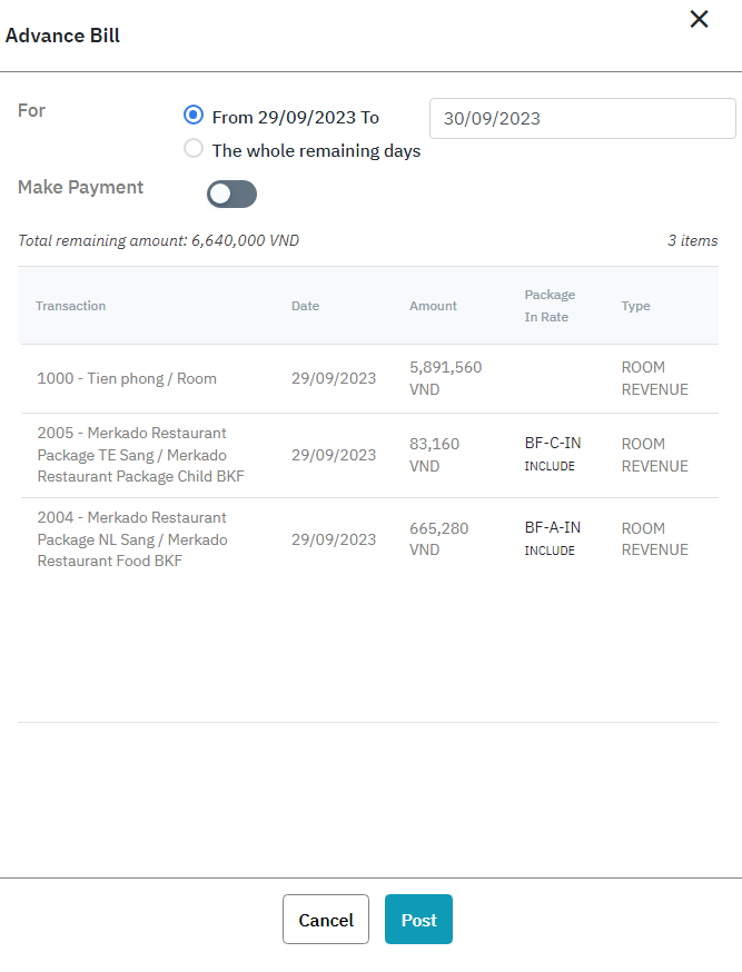 กด “Post” เพื่อทำการรันการชำระล่วงหน้าค่าห้อง |
