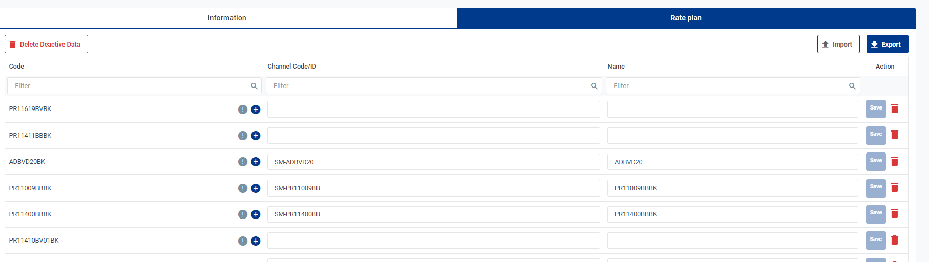 ![]() [Tab Rate Plan] - รายการรหัสราคาห้องพักคืนของการทำแผนที่ Mapping ![]() กรอกข้อมูลแล้วคลิกปุ่มบันทึกหรือเลือกไอคอนถังขยะที่จะลบ |