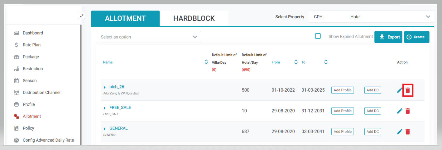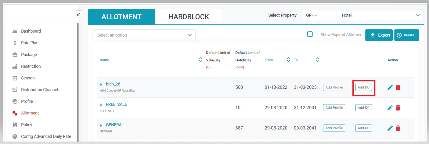 หลังจากสร้างกลุ่ม Allotment สำเร็จแล้ว Allotment นี้จะแสดงบนหน้าแรกของการจัดสรร allotment. [Delete Allotment Group] - ลบกลุ่ม Allotment![]() [Add DC] - เพิ่มช่องทางการขายห้องให้กับกลุ่ม Allotment