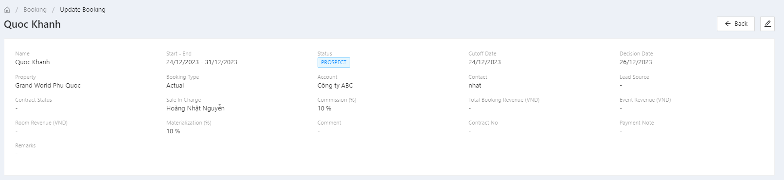 แผงข้อมูลการจองห้องพัก |