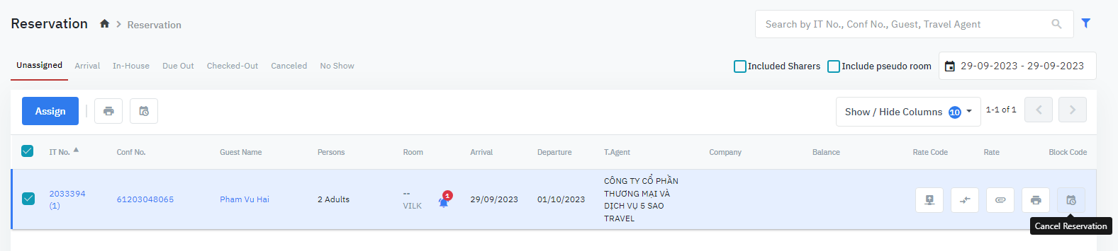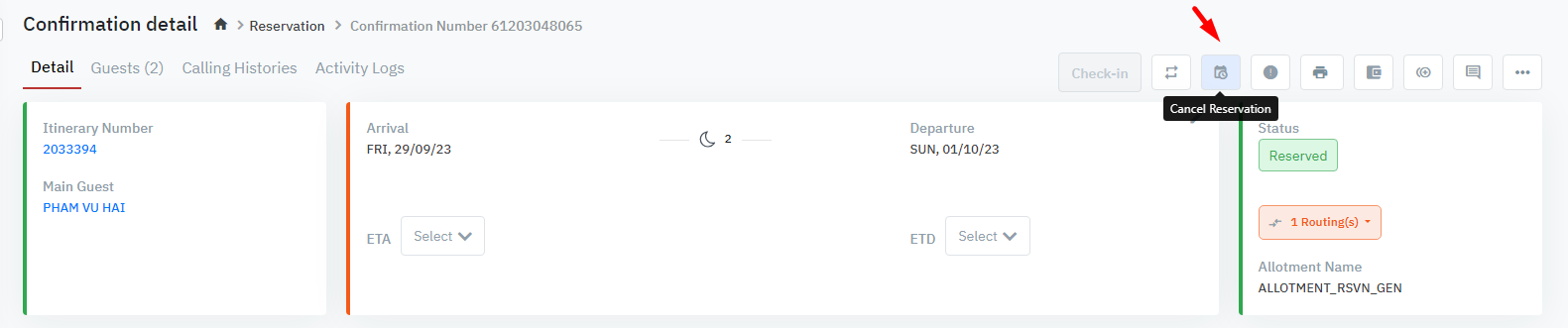 1. Log in – Front Office – Reservation – ที่แทป Unassigned & Arrival – เลือกรายการจอง – กด “Cancel Reservation“![]() 2. ที่หน้าจอ Confirmation Detail – กด “Cancel Reservation“![]() |