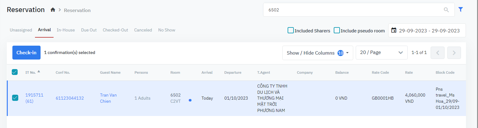 Log in – Front Office- Reservation – Tab Arrival – เลือกรายการจอง - คลิก “Check-in” |