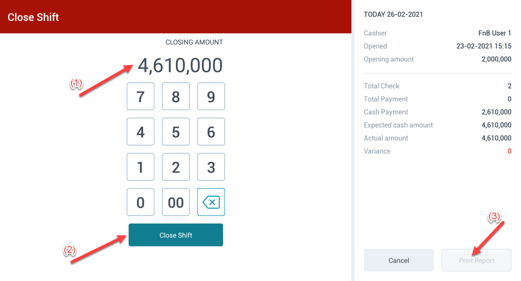 ขั้นตอนในการปิดกะ: บนหน้าจอหลัก คลิกที่ไอคอน “Time Clock” ที่มุมขวาของหน้าจอ. คลิกที่ปุ่ม “Close Shift” เพื่อปิดกะ หน้าจอการปิดกะจะปรากฏดังภาพด้านล่าง ![]() ทำตามขั้นตอนต่อไปนี้ตามลำดับเพื่อปิดกะ: