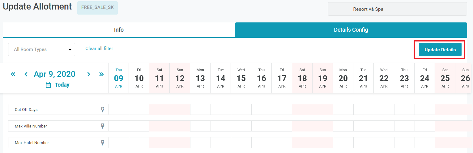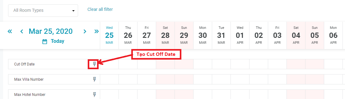 4. [Tab Details Config] - ตั้งค่ารายละเอียดงบประมาณห้องพักของช่องทางการขายห้องพัก4.1. กำหนด Cut Off Days ผู้ใช้สามารถจองห้องพักได้เฉพาะเมื่อ: วันที่จอง < วันที่เช็คอิน – Cut Off Day ของวันนั้น เลือกไอคอนสร้างด่วนของ Cut Off Day ![]() ![]()
