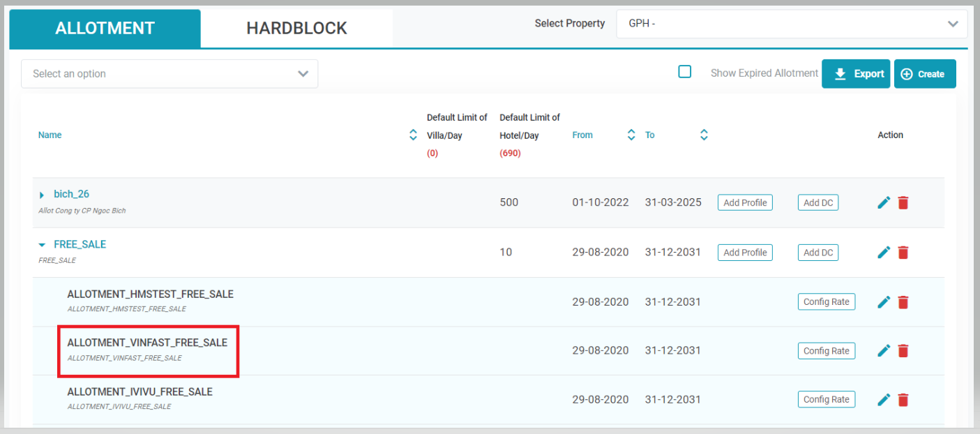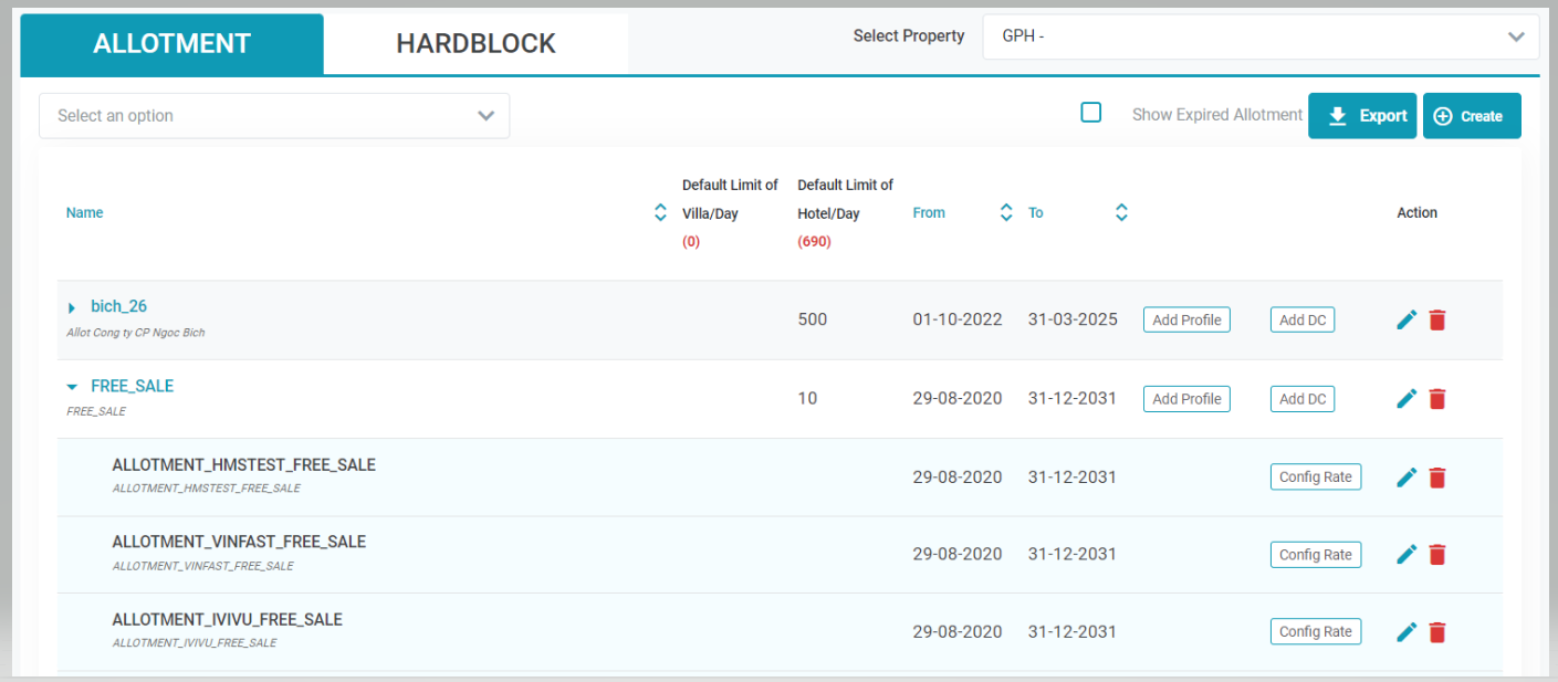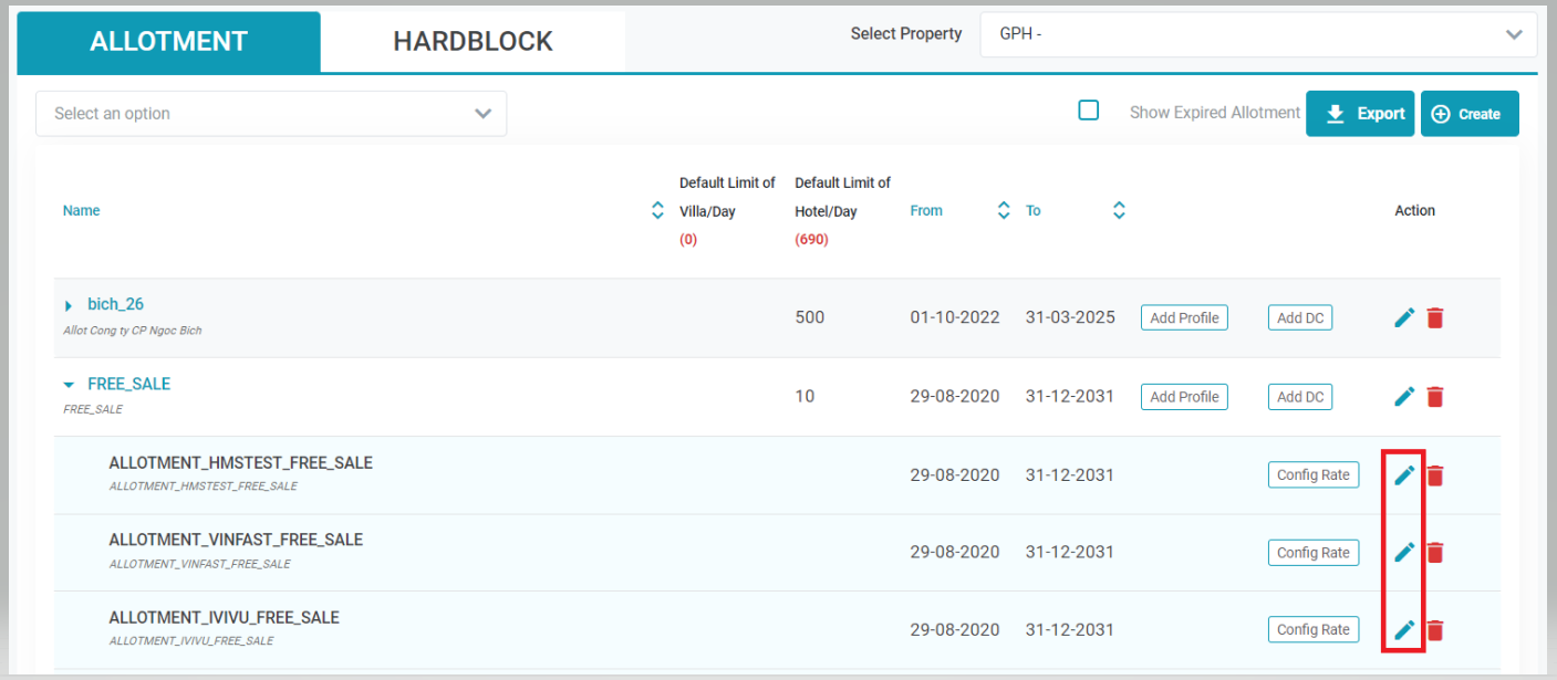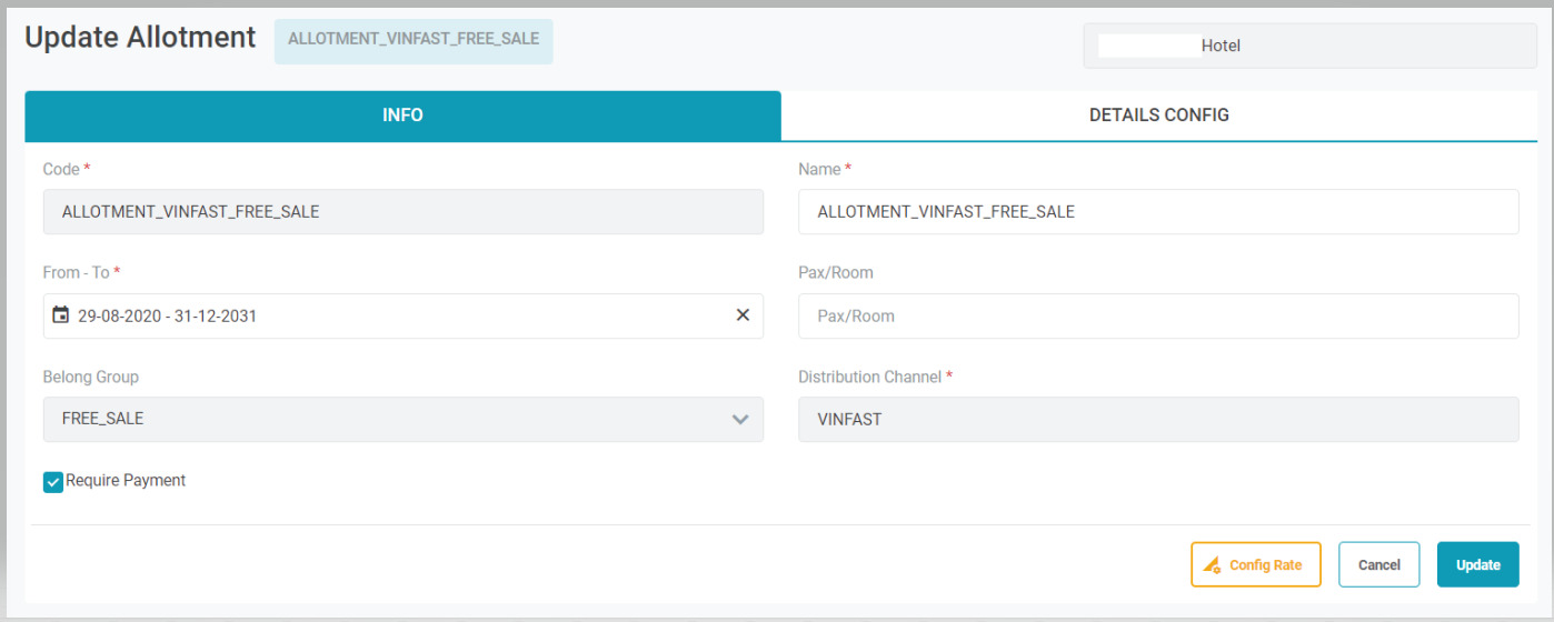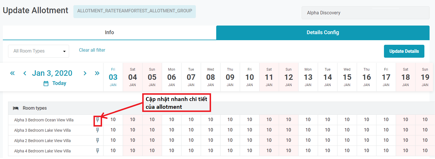 1. สร้าง Allotment สำหรับช่องทางการขายห้องกำหนดว่าจะสร้างกลุ่ม Allotment ใด จากนั้นจึงเพิ่ม DC เข้าในกลุ่ม Allotment . ![]() 2. ลบ Allotment ของช่องทางการขายห้องหากต้องการลบ Allotment ของช่องทางการขายห้อง ผู้ใช้เลือกไอคอนลบของช่องทางการขายห้องในหน้า Allotment ![]() 3. [Tab Info] - อัปเดตและเพิ่มรายละเอียดใหม่ใน Allotment ของช่องทางการขายห้องคลิกไอคอนอัปเดตเพื่ออัปเดตข้อมูล ![]() 3.1. อัพเดทข้อมูล Allotment ช่องทางการขายห้องพัก: ![]()