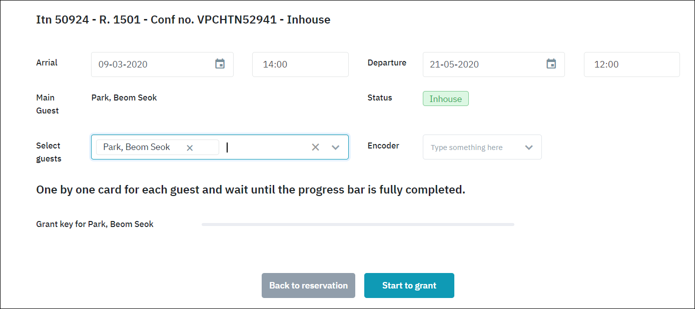 ผู้ใช้วางการ์ดบนตัวเครื่อง encoder ที่เลือกไว้บนหน้าจอ Grant Key, กรณีการวางบัตรอื่น encoder, ระบบจะแจ้งเตือนให้ผู้ใช้ตรวจสอบอีกครั้ง.ในขั้นตอนการตัดบัตรสำหรับหลายห้องและแขกที่แตกต่างกัน ผู้ใช้เพียงแค่วางบัตรทีละใบตามลำดับแถบสถานะที่แสดงบนระบบ.สามารถตัดบัตรได้เฉพาะการจองที่ได้รับการกำหนดห้องไว้ในระบบเท่านั้น. |