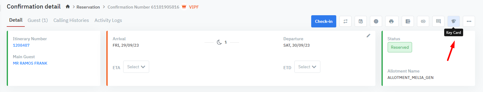 มี 3 วิธีในการเข้าถึงฟังก์ชั่นการออกบัตรคีร์การ์ดห้องพักให้กับลูกค้า: 1. [คีย์การ์ด] - ออกบัตรโดยตรงที่หน้าจอรายละเอียดการจองเข้าสู่หน้าจอรายละเอียดการจอง Confirmation Detail และคลิกไอคอน “Key Card”![]() ![]()