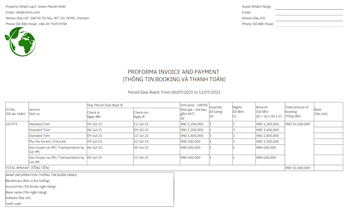 จากนั้นหน้าจอด้านล่างก็จะปรากฏขึ้นมา  Remove Package: ลบแพ็คเกจหลายคืนและหลายห้องในการจองแบบกลุ่ม  จากนั้นหน้าจอด้านล่างก็จะปรากฏขึ้นมา  Refresh Rate: อัปเดตราคา package ในรายการ Rate Codeให้กับ booking ที่ได้ทำการสำรองก่อนที่มีการเปลี่ยนแปลงราคา package.    + มี 3 ตัวเลือก: - Preview PDF: คลิกเพื่อดูใบแจ้งหนี้ชั่วคราวเป็นไฟล์ PDF ในแท็บเบราว์เซอร์ใหม่ - Download PDF: คลิกเพื่อดาวน์โหลดเวอร์ชัน PDF ไปยังอุปกรณ์ของคุณ - Download Excel: คลิกเพื่อดาวน์โหลดเวอร์ชัน Excel ไปยังคอมพิวเตอร์ของคุณ + ฟังก์ชันนี้ทำหน้าที่พิมพ์ประมาณการค่าใช้จ่ายของการจองเป็นกลุ่มหรือเป็นเลขIT ด้วยราคาเดียวกันตลอดเวลาของการเข้าพัก ประกอบด้วย: ค่าห้อง, fixed charge, package bookable + Proforma folio สามารถส่งออกได้สำหรับห้อง PM/COM/HUSE/NO-SHOW/CANCEL/EARLY CHECKED OUT + ห้องพักมี room typeเดียวกัน, arrival-departure, rate amount จะถูกรวมเป็น1บรรทัด + Proforma Invoice ตัวอย่าง:  เพิ่มการแจ้งเตือนทั้งหมดสำหรับการจองแบบกลุ่ม/ Alert. รายละเอียดดูที่หน้าฟังก์ชัน เพิ่มการแจ้งเตือน (Alert)  จดหมายยืนยัน/ Confirmation letter. เมื่อผู้ใช้คลิกที่ไอคอน Confirmation letter, นอกจากการตรวจสอบจดหมายยืนยันการจองแล้วยังมีฟังก์ชั่นเพิ่มเติมอีก:  (1) Edit Confirm Email/ แก้ไขข้อมูล: ผู้ใช้สามารถใช้ฟังก์ชันนี้เพื่อแก้ไขข้อมูลในจดหมายยืนยันการจองก่อนส่งให้ลูกค้า. หมายเหตุ: Confirmation letter เป็นข้อมูลสำคัญในการยืนยันการจองห้องกับลูกค้า ดังนั้นจึงจำเป็นต้องตรวจสอบข้อมูลที่แก้ไขทั้งหมดอย่างรอบคอบเพื่อหลีกเลี่ยงการร้องเรียนที่ไม่จำเป็นจากลูกค้า (2) Send Email/ ส่งอีเมลยืนยันการจองห้องพัก: คลิกเพื่อส่งอีเมลยืนยันการจองห้องพัก (3) Print Confimation letter/ พิมพ์จดหมายยืนยันการจองห้องพัก: คลิกเพื่อพิมพ์จดหมายยืนยันการจองห้องพัก