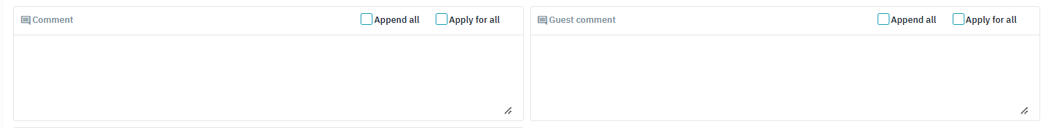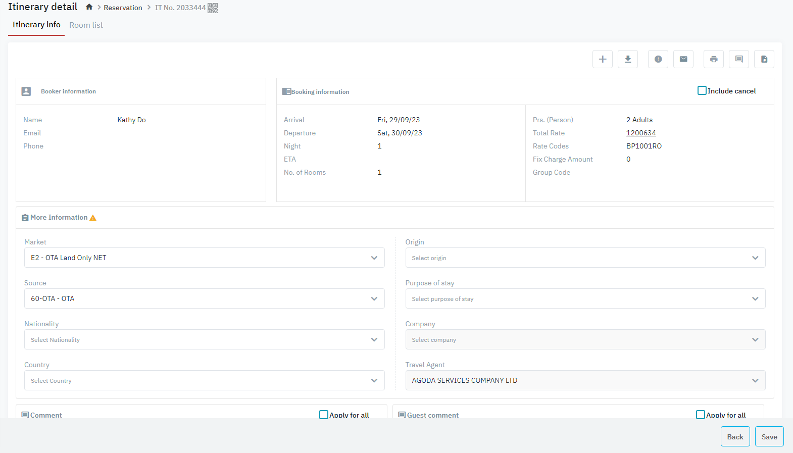 Guest Comment: - แสดงความคิดเห็นการจองจากแหล่งอื่นที่ไหลเข้าสู่ระบบ - ข้อมูลที่ Guest comment จะแสดงที่: Report Arrival/Guest Inhouse rate check/Guest Inhouse, comment Clone Booking/cross selling, activity logs, comment ที่ PCM/import Booking/create booking. - ผู้ใช้มีสิทธิ์ป้อนข้อมูลสำหรับการจองแต่ละครั้งหรือเลือกสมัครทั้งหมดบนหน้าItinerary detail. Comment: - เรียกว่าความคิดเห็นภายใน(internal comment) ใช้ในการระบุหมายเหตุของสถานประกบการและนอกขอบเขตของ Guest Comment. - ข้อมูลในช่องนี้จะถูกใช้และแสดงที่ PMS เท่านั้น และไม่มีบันทึก activity logs. - ผู้ใช้มีสิทธิ์ป้อนข้อมูลสำหรับการจองแต่ละครั้งหรือเลือกสมัครทั้งหมดบนหน้าItinerary detail. เลือกฟังก์ชั่นเพื่อใช้เนื้อหาหมายเหตุกับการจองทั้งหมดในกลุ่มเดียวกัน ( มีรหัส ITเดียวกัน ) - Append all: เลือกอัปเดตเนื้อหาเพิ่มเติมแต่จะไม่เขียนทับหรือลบความคิดเห็นเดิมของการจอง booking. - Apply for all: การเลือกนี้จะเขียนทับเนื้อหาความคิดเห็นเก่าก่อนหน้านี้ทั้งหมดที่มีอยู่ใน booking.