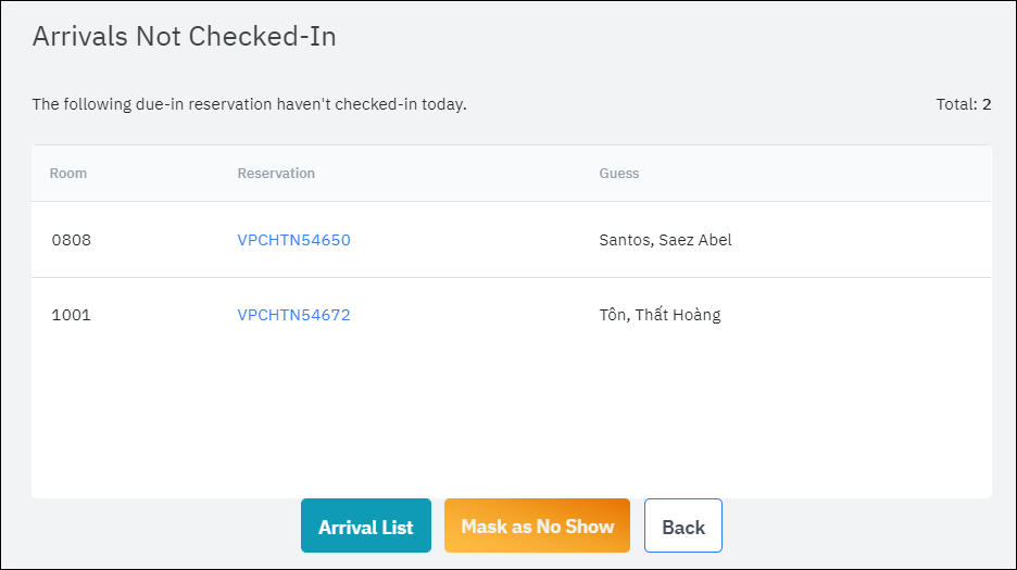 ขั้นตอนที่ 2: DEPARTURES NOT CHECKED OUT - ตรวจสอบข้อมูลลูกค้า Check-outขั้นตอนที่ 3: ARRIVALS NOT CHECKED IN - ตรวจสอบข้อมูลของผู้ที่จะเช็คอิน![]()