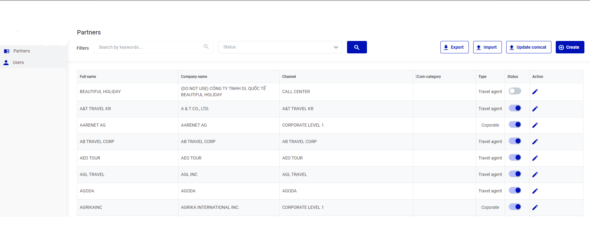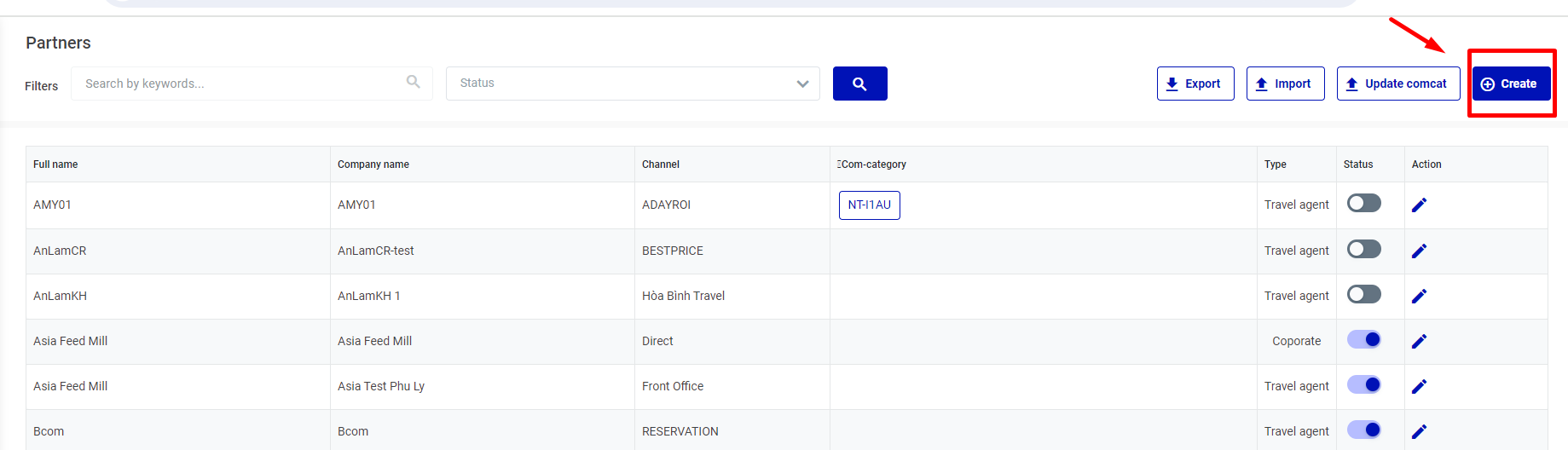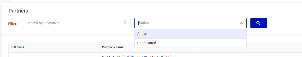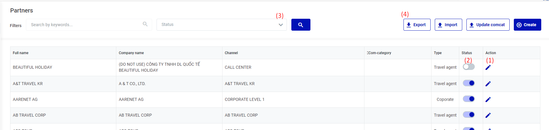 o (1) แก้ไข/Update: อัปเดตข้อมูลตัวแทนที่สร้างขึ้น o (2) ไม่ใช้งาน/ Inactive: คลิกที่นี่ TA จะสลับเป็นสถานะไม่ใช้งาน/ไม่ใช้งาน o (3) ตัวกรอง/ Filter: ค้นหาตามชื่อ รหัสภาษี กรองตามสถานะ ![]() o (4) ส่งออกข้อมูล/Export , นำเข้าข้อมูล/Import, อัปเดต comcat/Update comcat, สร้างใหม่/Create: สร้างข้อมูลตัวแทนใหม่ |