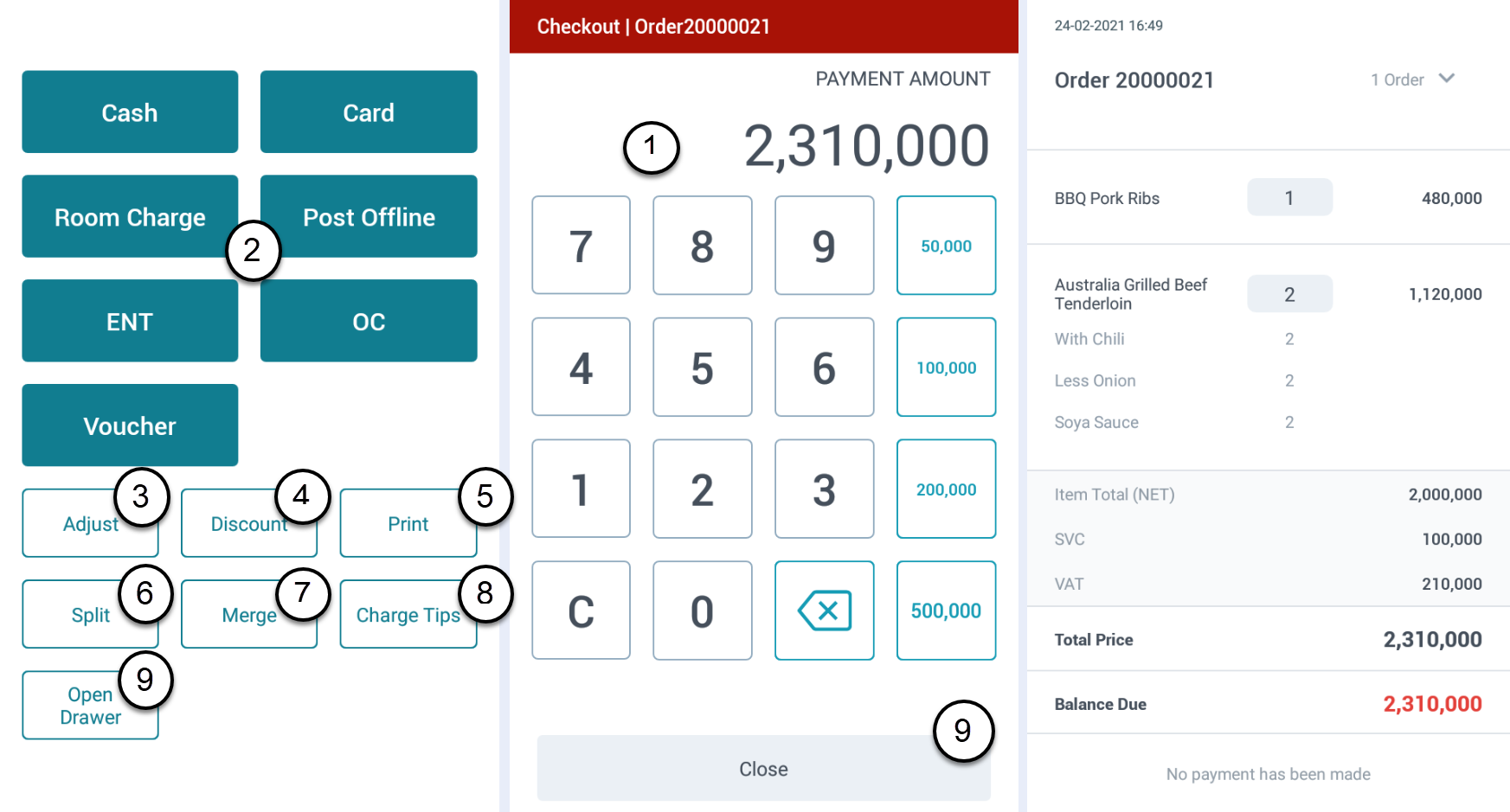 ![]() ที่หน้าจอบันทึกการชำระเงิน: Total Price : มูลค่ารวมของใบแจ้งหนี้ Balance Due: ยอดค้างชำระทั้งหมด (1) กรอกจำนวนเงินที่ชำระ (2) เลือกวิธีการชำระเงินที่เกี่ยวข้อง (3) Adjust: ปรับจำนวนเงิน (ถ้าจำเป็น) (4) Discount: ใช้ส่วนลดกับกลุ่มหรือคำสั่งซื้อทั้งหมด (5) Print: พิมพ์ใบแจ้งหนี้ชั่วคราว (6) Split: แยกคำสั่ง (7) Merge: รวมคำสั่งซื้อ (8) Charge Tip: บันทึกยอดทิป (ถ้ามี) (9) Close: ออกจากหน้าจอการชำระเงิน หลังจากเลือกวิธีการชำระเงินแล้ว แบบฟอร์มการชำระเงินและจำนวนเงินจะปรากฏบนหน้าจอด้านล่าง: ![]() (1) แบบฟอร์มและจำนวนเงินที่ชำระตามแบบฟอร์มนี้ (2) Pay: คลิกปุ่มชำระเงินเพื่อบันทึกการชำระเงินสำหรับคำสั่งซื้อให้เสร็จสิ้น ![]() หากคุณต้องการลบวิธีการชำระเงิน ให้คลิกที่ไอคอนเลิกทำนี้ |