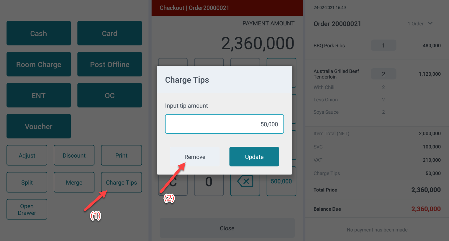 ในกรณีที่มีรูปแบบการชำระเงินมากกว่า 1 รูปแบบ เมื่อคลิกชำระเงิน ระบบจะขอให้เลือกรูปแบบการชำระเงินสำหรับทิป คลิกตกลงเพื่อยืนยัน ![]() *** หากคุณต้องการลบ Tip ให้คลิก Charge Tip และดำเนินการ Remove Charge Tip ![]() |