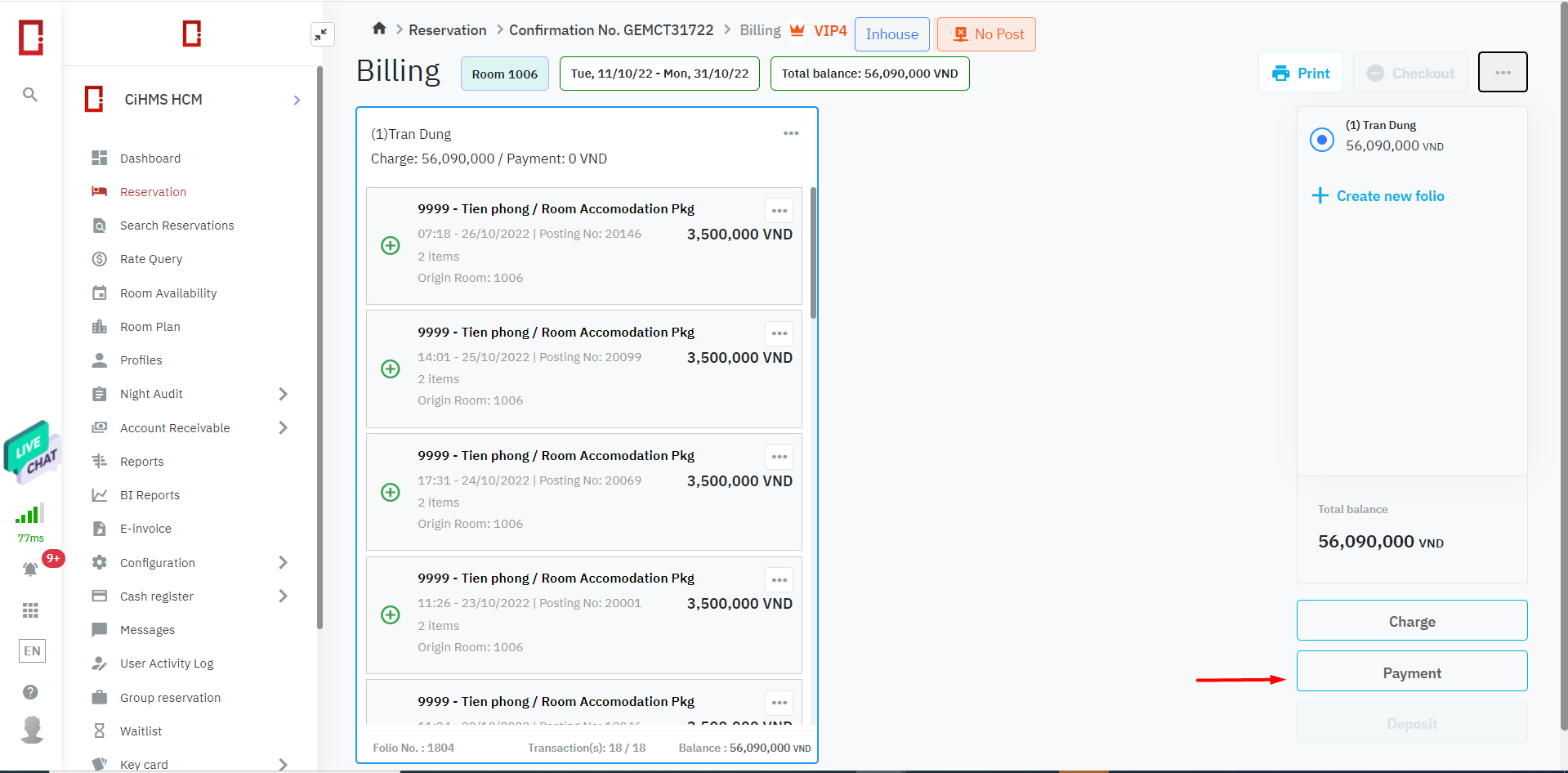 Log in - Front Office - Reservation (การจอง) - Billing |