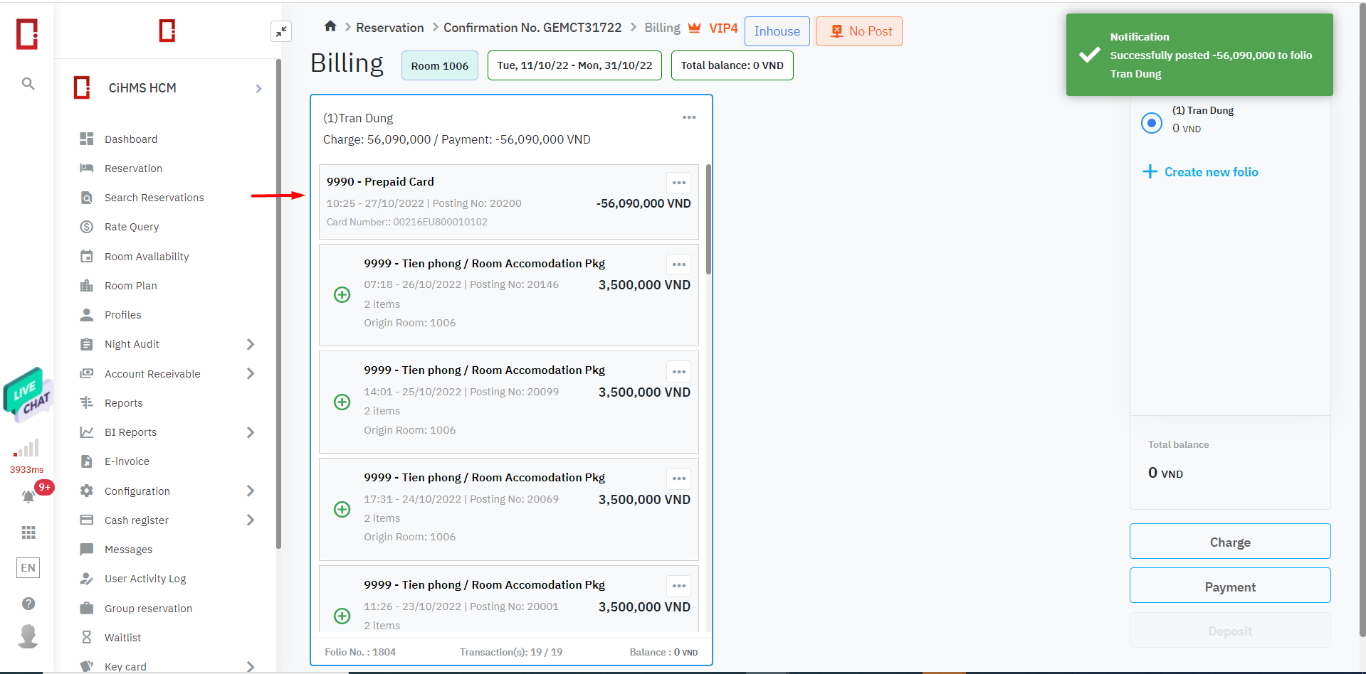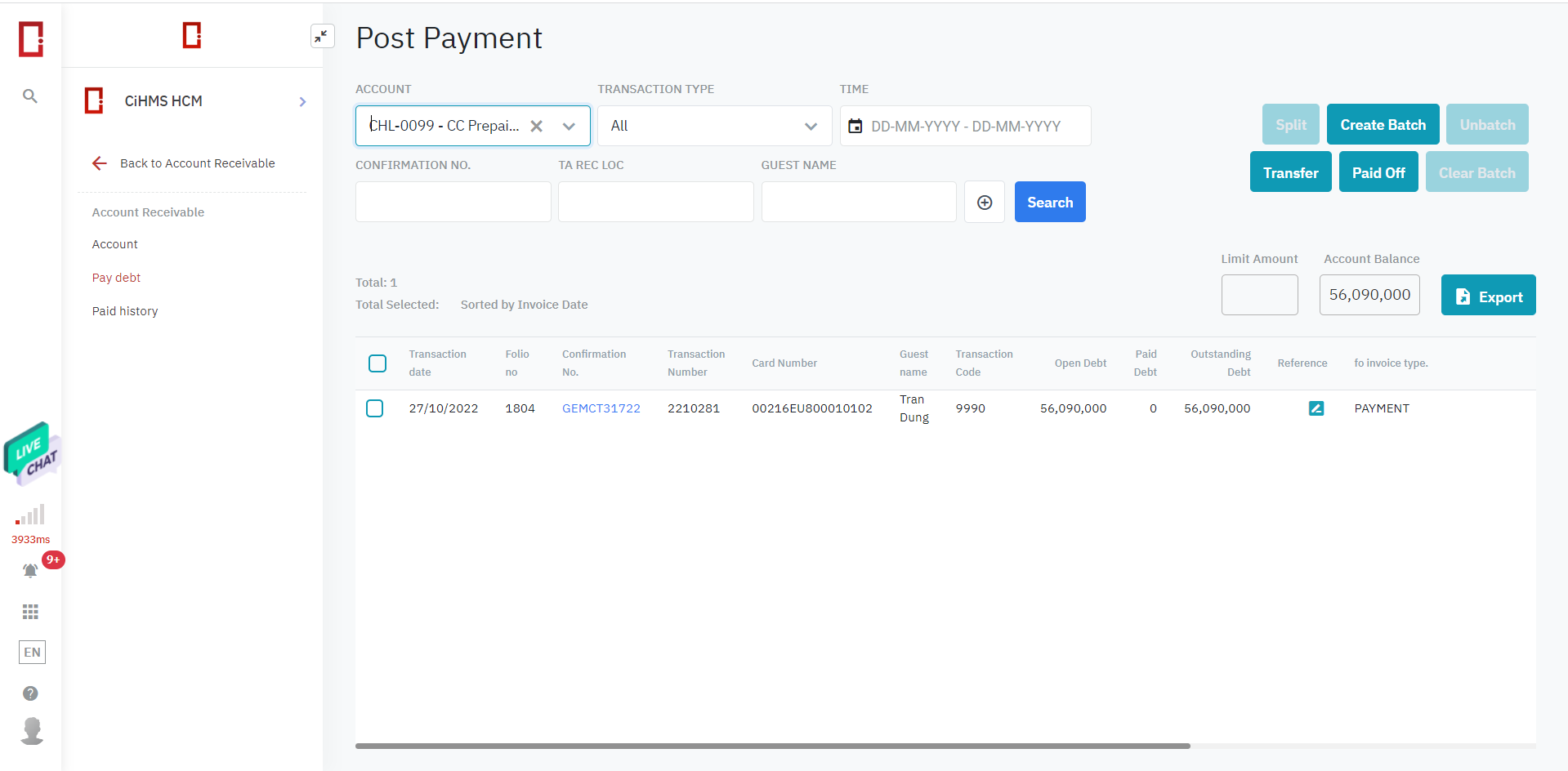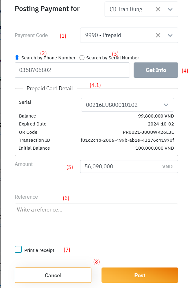 ที่หน้า Billing เลือก “Payment”![]() ![]() (1) Payment Code: เลือก transaction code ที่ตรงกับรูปแบบการชำระด้วย Prepaid Card (2) Search by Phone Number: กรอกหมายเลขโทรศัพท์ของคุณเพื่อค้นหาข้อมูลบัตรเพื่อชำระเงินด้วย prepaid card (3) Search by Serial Number: กรอกหมายเลขซีเรียลเพื่อค้นหาข้อมูลบัตรเพื่อชำระเงินด้วย prepaid card (4) เลือก Get Info เพื่อ generate ข้อมูลของบัตร prepaid card ที่ (4.1) Serial Balance Expired date QR code Transaction ID Initial Balance (5) Amount: ป้อนจำนวนเงินที่ต้องชำระสำหรับธุรกรรมนี้ (6) Reference: ป้อนข้อมูลหมายเหตุสำหรับรูปแบบการชำระเงินนี้ (7) Print receipt: พิมพ์ใบเสร็จรับเงินสำหรับรูปแบบการชำระเงินนี้ (8) Save - Cancel: บันทึก - ยกเลิกการทำธุรกรรม หลังจากชำระเงินเรียบร้อยแล้ว ข้อมูลการเรียกเก็บเงินจะแสดงดังนี้: ![]() ข้อมูลการทำธุรกรรมจะแสดงใน Account Receivable ของ Account นี้ เพื่อให้บัญชีทำการติดตามข้อมูล: ![]() |