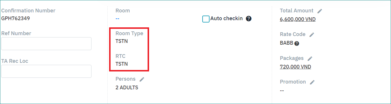 ตัวอย่าง: การจองปัจจุบันเป็นห้องประเภท TSTN ผู้เข้าพักขอเปลี่ยนเป็นประเภทห้องพัก KSTN ![]() กรณีเลือก Charge, หน้ารายละเอียดการจองห้องพักจะแสดงข้อมูล Room Type = Room To Charge สอดคล้องกับประเภทห้องพักใหม่และราคาห้องพัก (Room Type = RTC=KSTN) ![]() กรณีที่เลือก FOC, หน้าจอรายละเอียดการจองจะแสดงประเภทห้องเป็นประเภทห้องใหม่ แต่ห้องที่เรียกเก็บเงินจะแสดงประเภทห้องเดิมตามราคาของประเภทห้องเดิม (Room Type = KSTN ; RTC = TSTN) ![]() |