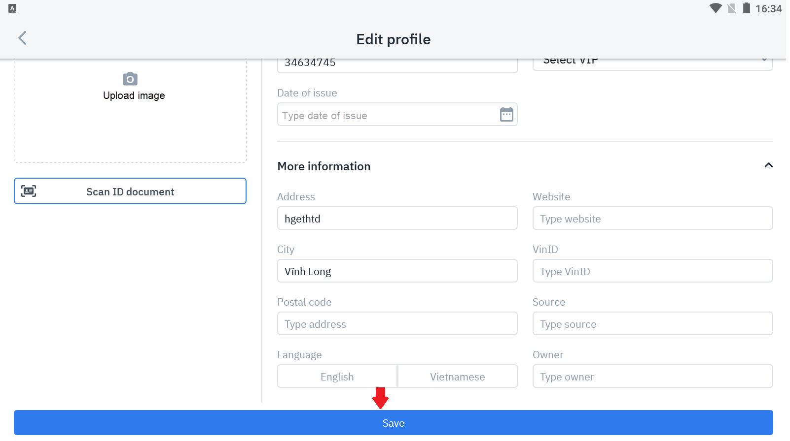 6. ข้อมูลโปรไฟล์ลูกค้าได้รับการอัพเดตโดยอัตโนมัติจากระบบ คลิกไอคอน ดินสอ เพื่อไปที่หน้าจอแก้ไขข้อมูลลูกค้าเพื่อตรวจสอบหรือแก้ไขข้อมูล ![]() 7. ที่หน้าจอแก้ไขข้อมูลลูกค้า แก้ไขหากข้อมูลไม่ถูกต้อง (ระบบอาจจดจำอักขระผิดหากคุณภาพของเอกสารประจำตัวไม่ดี) หรือเพิ่มข้อมูลอื่น ๆ. ![]() 8. หลังจากแก้ไขและตรวจสอบแล้ว ให้คลิก ปุ่ม บันทึกข้อมูลเ พื่อบันทึกข้อมูลโปรไฟล์ลูกค้า. |