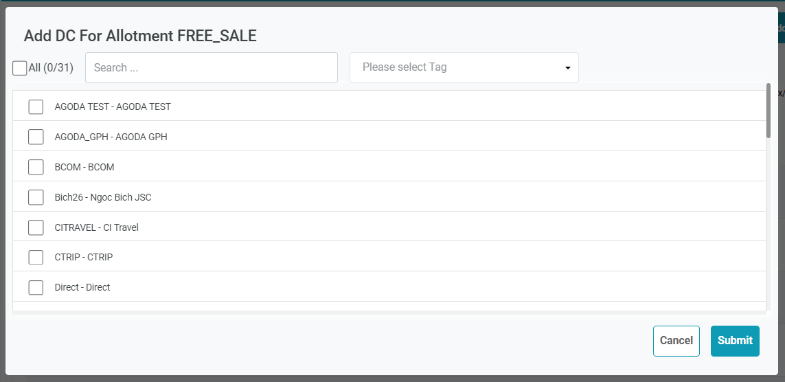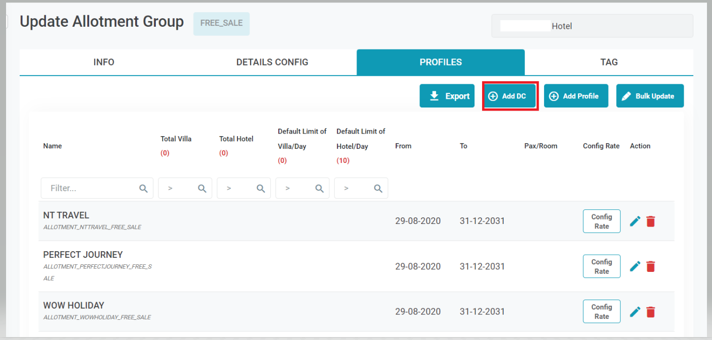 2.2. ตารางผลลัพธ์: แสดงรายการโดยละเอียดของจำนวนห้องตามวันที่และประเภทห้องที่ประกาศแอปพลิเคชันรองรับการกรองข้อมูลตามห้องเพื่ออำนวยความสะดวกในการค้นหาของผู้ใช้ เลือกล้างตัวกรองทั้งหมดเพื่อลบข้อมูลที่กรองก่อนหน้านี้ทั้งหมด. ![]() 3. [Tab Profile] – ช่องทางการขายห้องพักของกลุ่ม Alloment3.1 Add DC / Add Profile ในกลุ่ม Allotment3.1.1. ประกาศช่องทางการขายห้องพักใช้ได้กับกลุ่มAllotment คลิก “เพิ่ม DC” เพื่อเพิ่มช่องทางการขายห้องพัก![]() ![]() สามารถค้นหาด้วยคำสำคัญ/กรองตามแท็ก 3.1.2. ประกาศประวัติตัวแทนที่เกี่ยวข้องกับกลุ่ม Allotment . คลิก “Add Profile” เพื่อเพิ่มโปรไฟล์ตัวแทน![]() ![]() สามารถค้นหาด้วยคำสำคัญ/กรองตามแท็ก 3.2. รายชื่อช่องทางการขายห้องพักของกลุ่ม Allotment .ช่องข้อมูลจะแสดงจำนวนห้องสำหรับขายที่ประกาศใน Tab Info ![]() 3.3. ใส่รหัสราคา/แก้ไข/ลบข้อมูล DC ในกลุ่ม Allotment