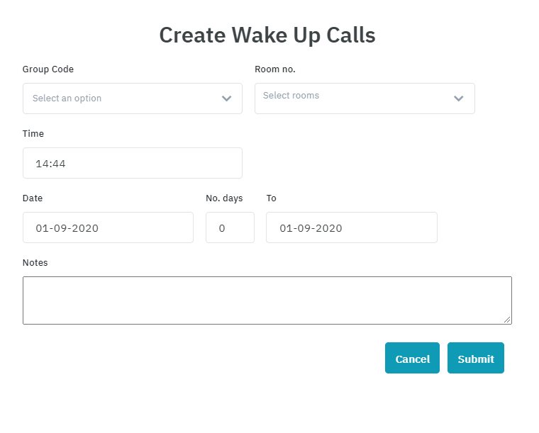 สร้างการโทรปลุก:![]() สร้างการโทรปลุกสำหรับลูกค้ารายย่อย: ![]() ผู้ใช้สามารถเลือกห้องพักตั้งแต่หนึ่งห้องขึ้นไปเพื่อสร้างบริการโทรปลุกได้ในเวลาเดียวกับที่ต้องการ สร้างการโทรปลุกสำหรับลูกค้าที่มาเป็นกลุ่ม: ![]() ผู้ใช้เลือกรหัสกลุ่มของกลุ่ม จากนั้นเลือกห้องในกลุ่มที่อยู่ในรายการเพื่อตั้งปลุก Time: ตั้งเวลาปลุก ผู้ใช้สามารถเลือกหมายเลขบนแดชบอร์ดหรือป้อนเวลาที่ต้องการตั้งปลุกบนกระปุกเกียร์ได้โดยตรง ![]() Date: วันที่เริ่มต้นของการปลุก No.days: จำนวนวันในการตั้งปลุก คำนวณตั้งแต่เริ่มต้นการปลุกจนถึงสิ้นสุดการตั้งค่าการปลุก ( To ) To: ผู้ใช้ตั้งค่าวันที่สิ้นสุดสำหรับการดำเนินการแจ้งเตือน Note: บันทึกข้อมูลที่จำเป็นสำหรับการโทร ![]() Submit: ยืนยันการสร้างการเตือนโทรปลุก ยกเลิกการโทรปลุก:![]() ผู้ใช้สามารถเลือกการโทรปลุกที่ติดตั้งไว้ก่อนหน้านี้เพื่อยกเลิกพร้อมกันได้ เลือกห้องที่ต้องการยกเลิกการเตือนภายในระยะเวลาและข้อมูลที่จะยกเลิก เลือก Cancel และกด OK เพื่อยืนยันการยกเลิกสายปลุกที่เลือก: ![]() |
