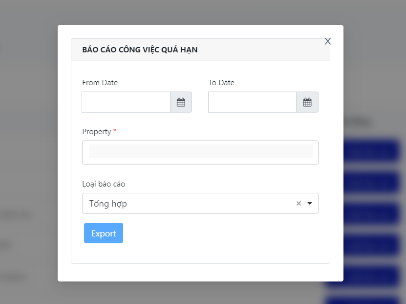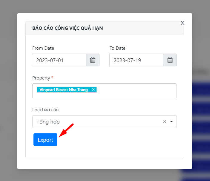 II. Báo cáo tổng hợp công việc quá hạnSau khi nhập đầy đủ các thông tin ở phần bộ lọc, người dùng chọn “Export” để thực hiện xuất file báo cáo theo định dạng Excel ![]() ![]()