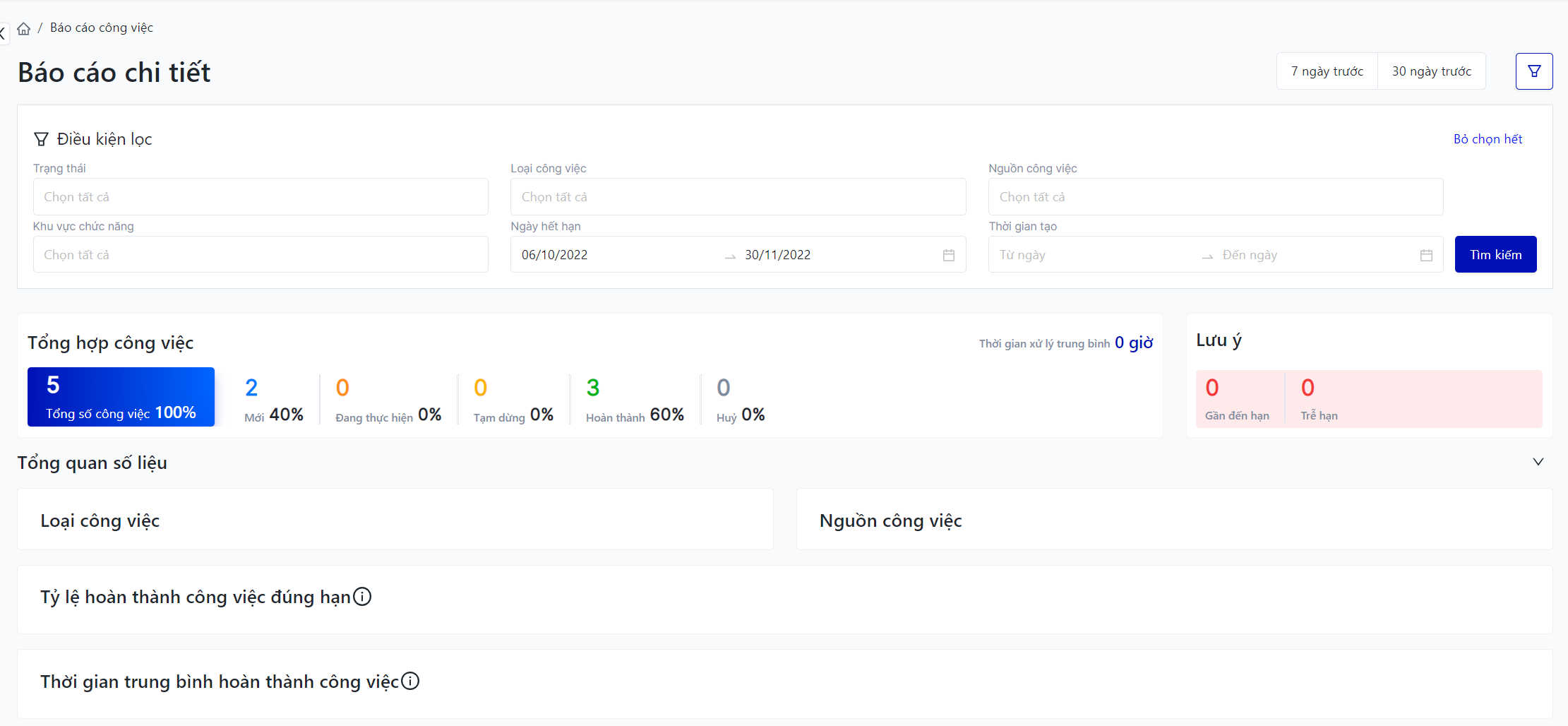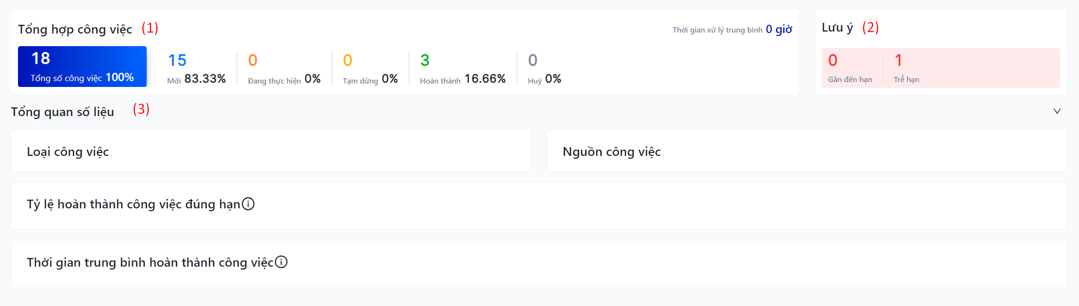 (2) Lưu ý: Hiển thi số công việc gần đến hạn và số công việc trễ hạn trong thời gian người dùng tìm kiếm (3) Tổng quan số liệu:
