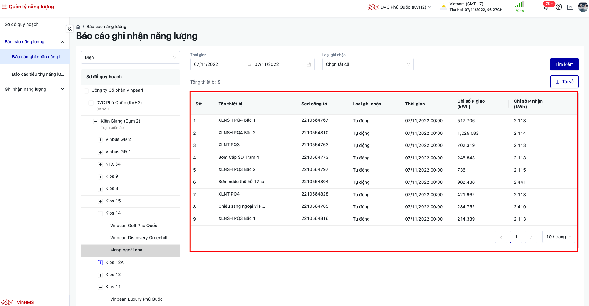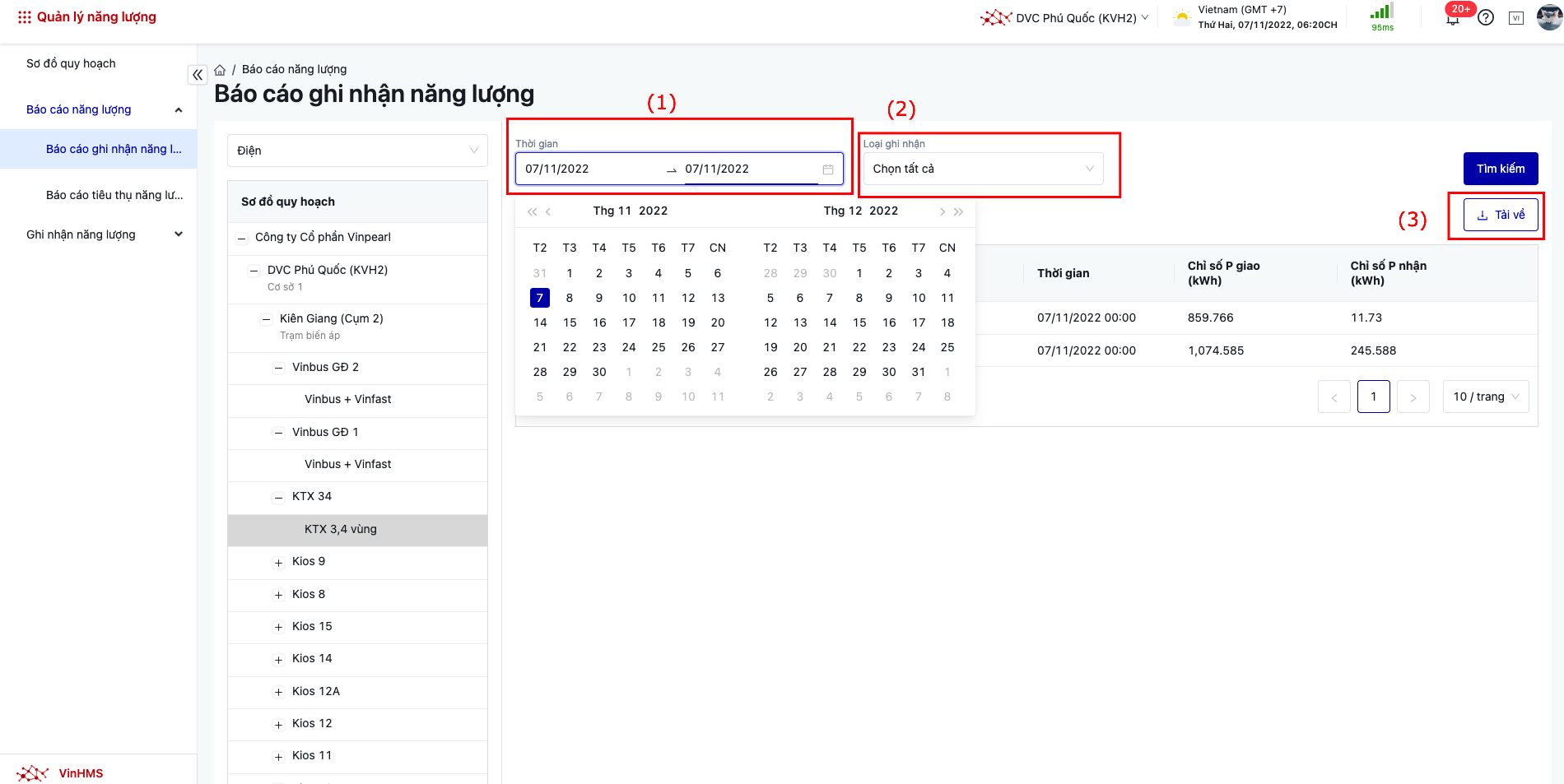 Đăng nhập → Quản lý năng lượng → Báo cáo ghi nhận năng lượng |