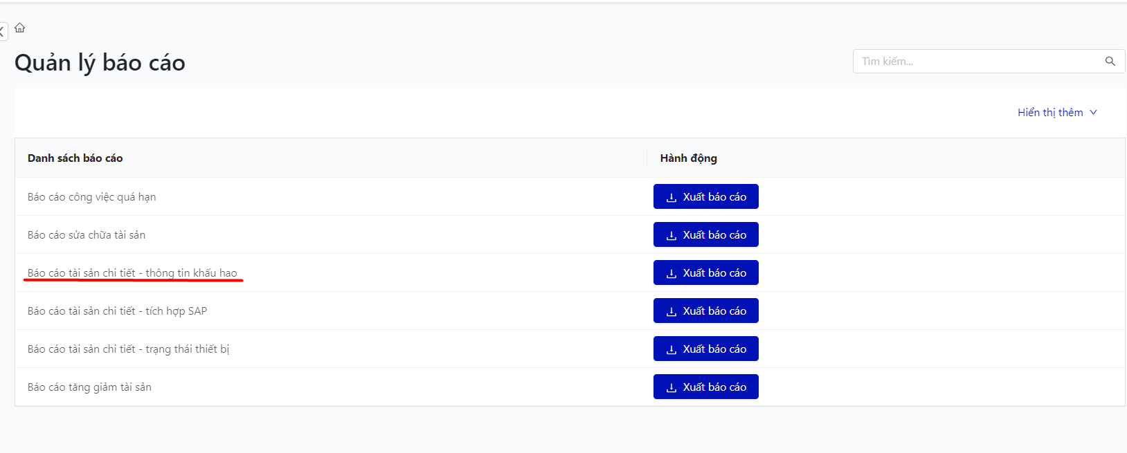 Đăng nhập – Quản lý báo cáo – Báo cáo tài sản chi tiết - thông tin khấu hao |