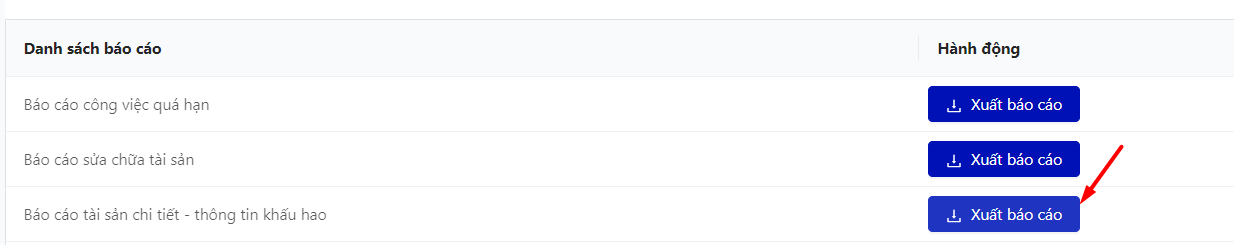 II. Chi tiết báo cáo tài sản chi tiết - thông tin khấu haoSau khi nhập đầy đủ các thông tin ở phần bộ lọc, người dùng chọn “Export” để thực hiện xuất file báo cáo theo định dạng Excel ![]() ![]()