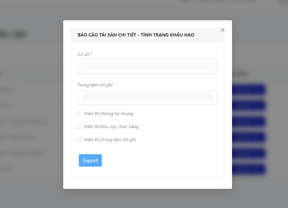 I. Các điều kiện lọc và tìm kiếm báo cáo tài sản chi tiết - thông tin khấu haoNgười dùng cần chọn vào mục 'Xuất báo cáo” để xuất hiện các điều kiện lọc ![]() ![]() Hệ thống sẽ xuất hiện các điều kiện lọc như:
