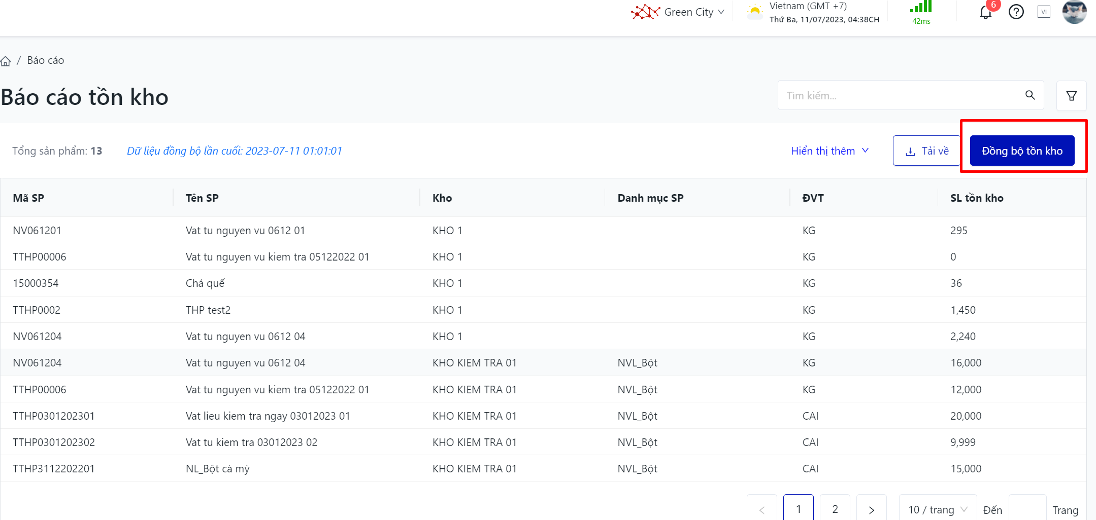 Đăng nhập – Quản lý kho – Báo cáo – Báo cáo tồn kho |