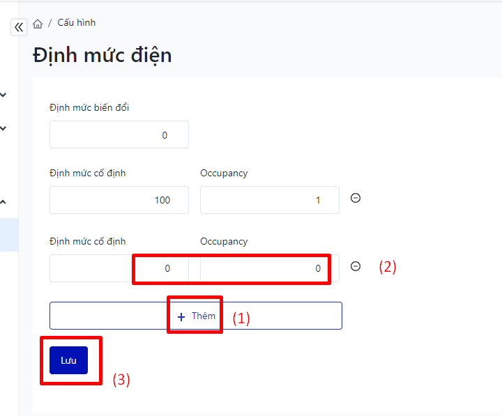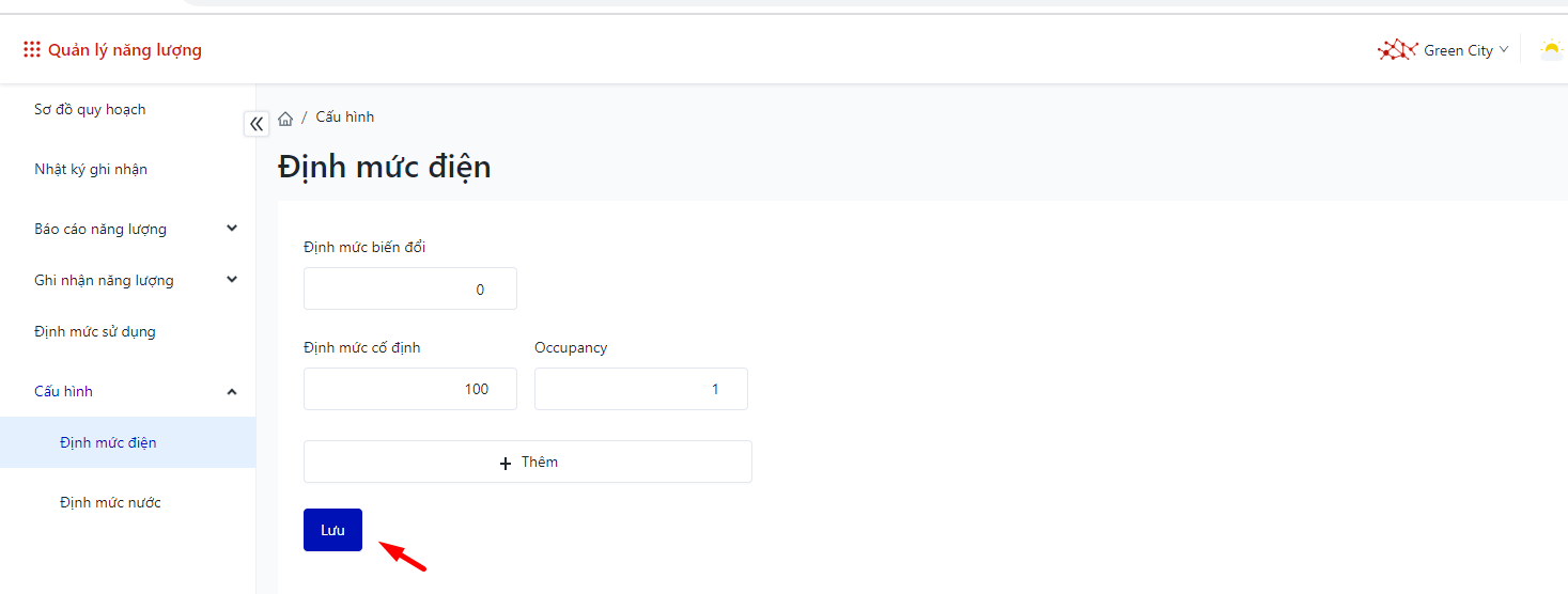 ![]() Sau khi điền các chỉ số, chọn nút “Lưu” để hoàn tất. Người dùng nhấn chọn nút thêm để bổ sung thiết lập định mức cố định, Occupancy cho năng lượng điện.