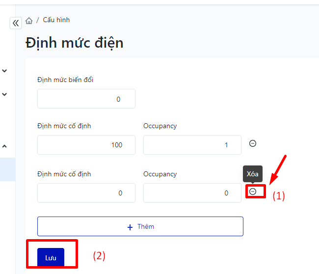 ![]() Người dùng nhấn chọn nút xóa để xóa thiết lập định mức điện