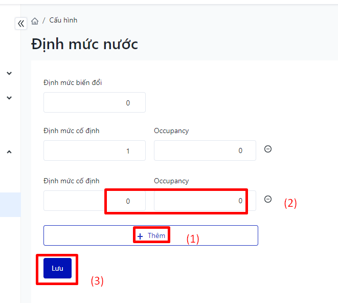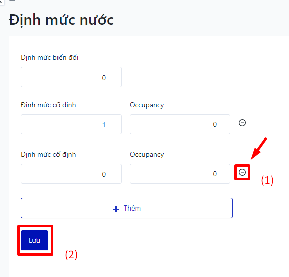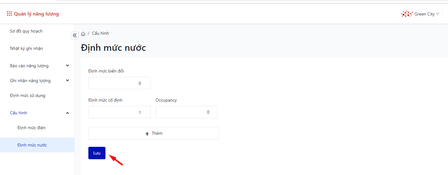 ![]() Sau khi điền các chỉ số, chọn nút “Lưu” để hoàn tất. Người dùng nhấn chọn nút thêm để bổ sung thiết lập định mức cố định, Occupancy cho năng lượng nước.