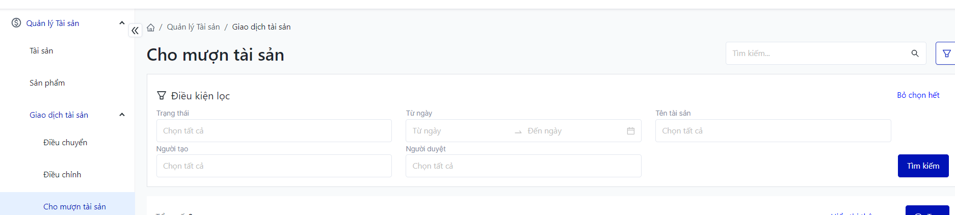 I. Các điều kiện lọc và tìm kiếm phiếu cho mượn tài sản![]()