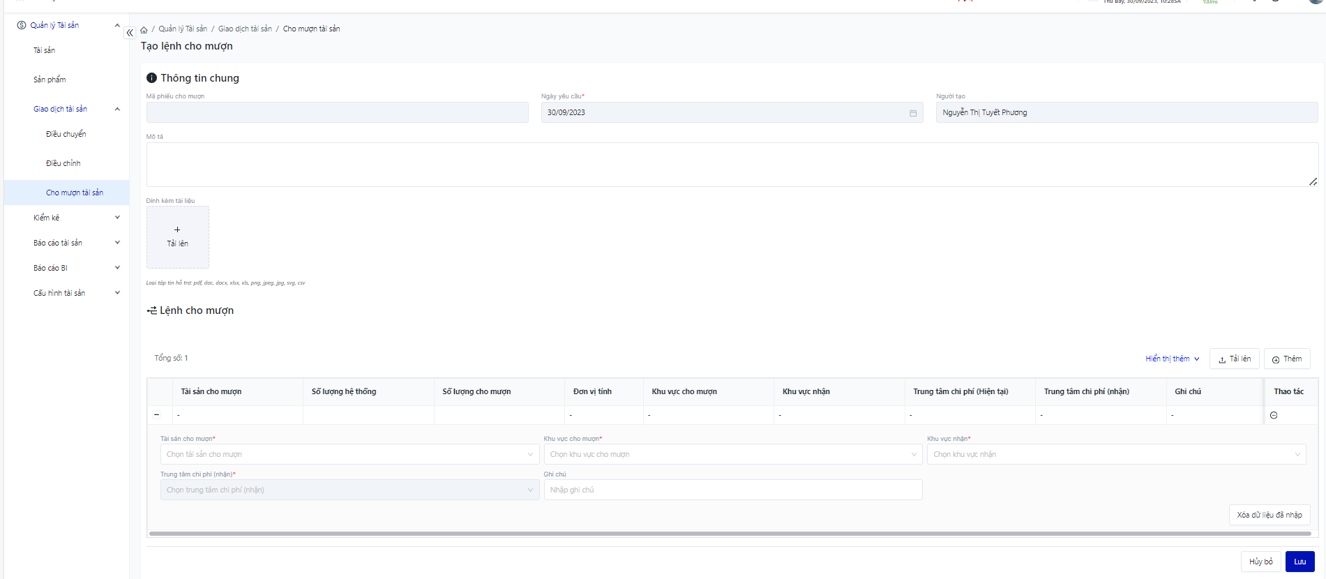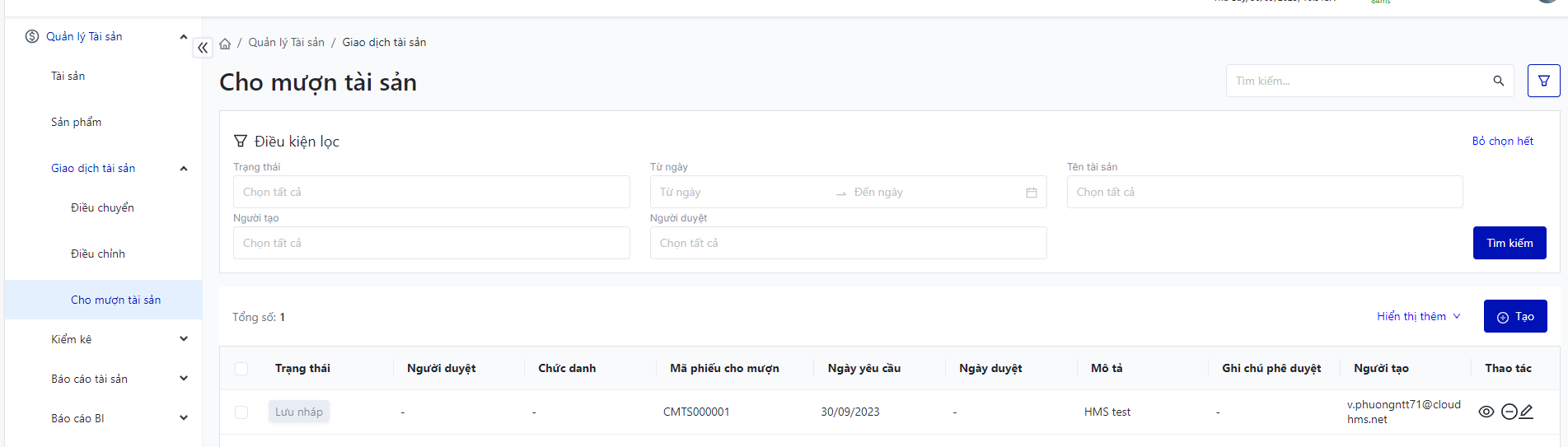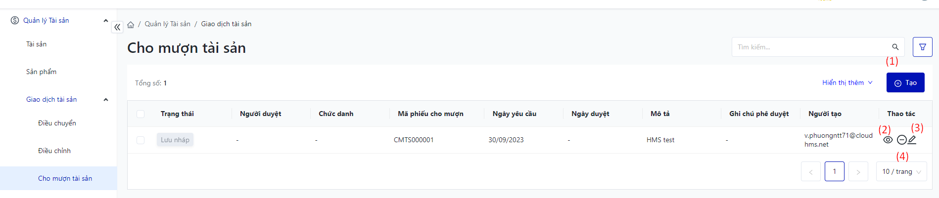 Đăng nhập – Tài sản doanh nghiệp – Giao dịch tài sản – Cho mượn tài sản |
