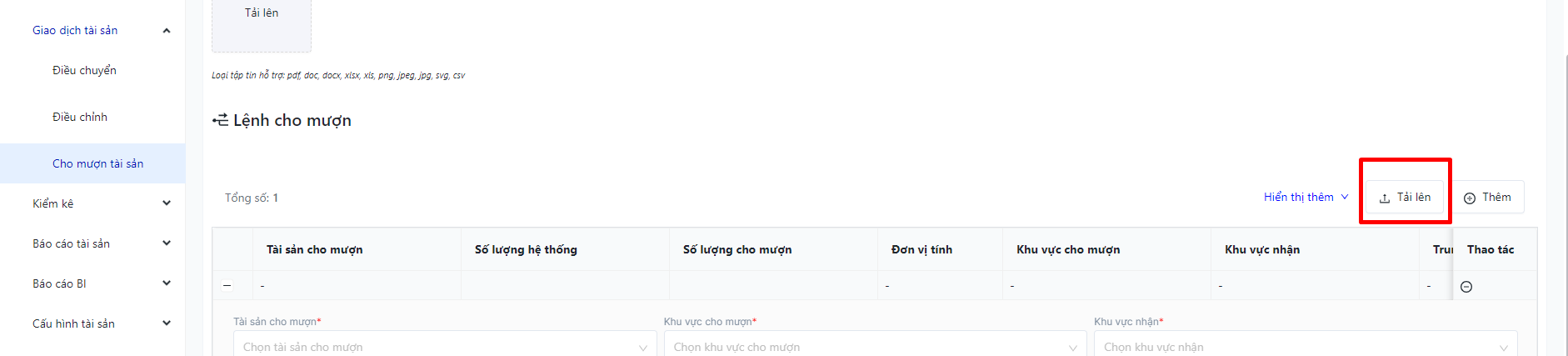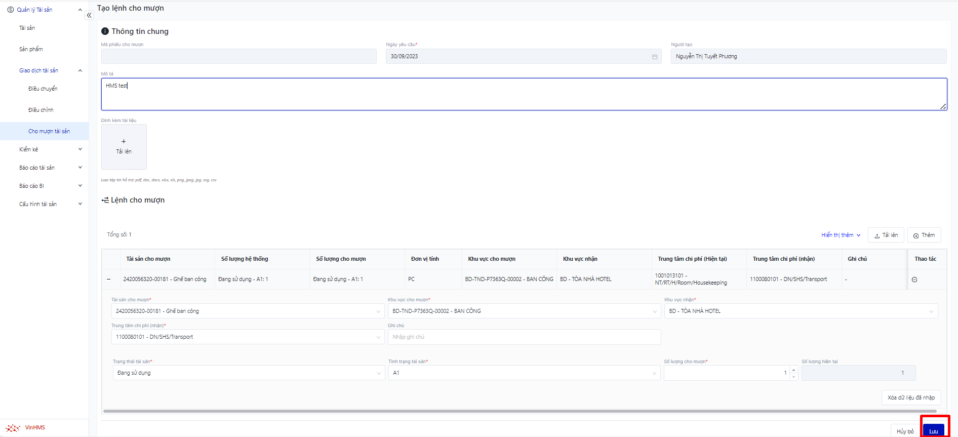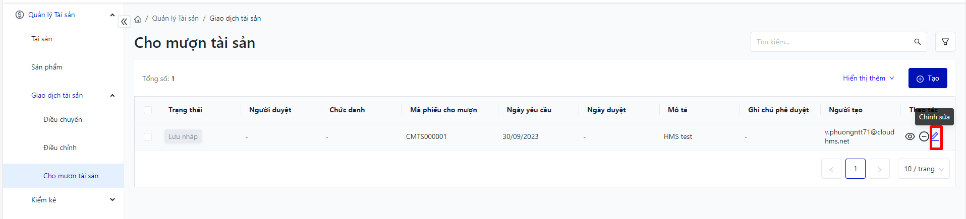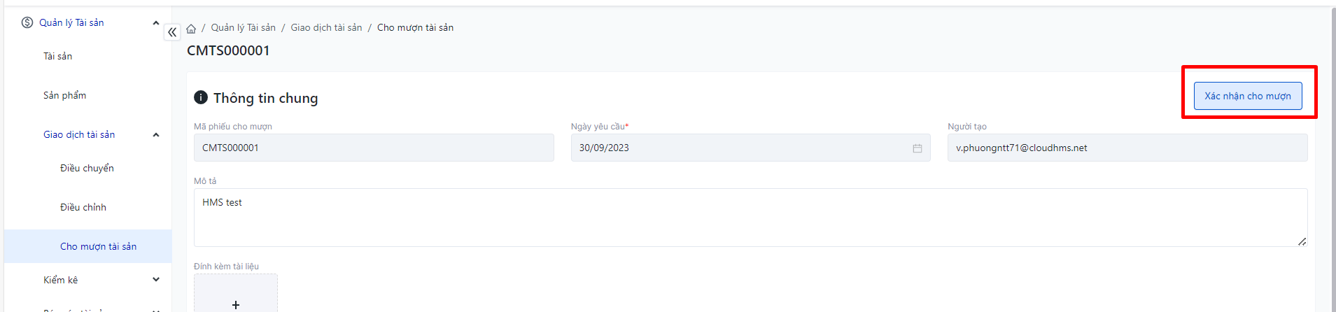 Đăng nhập – Tài sản doanh nghiệp – Giao dịch tài sản – Cho mượn tài sản |