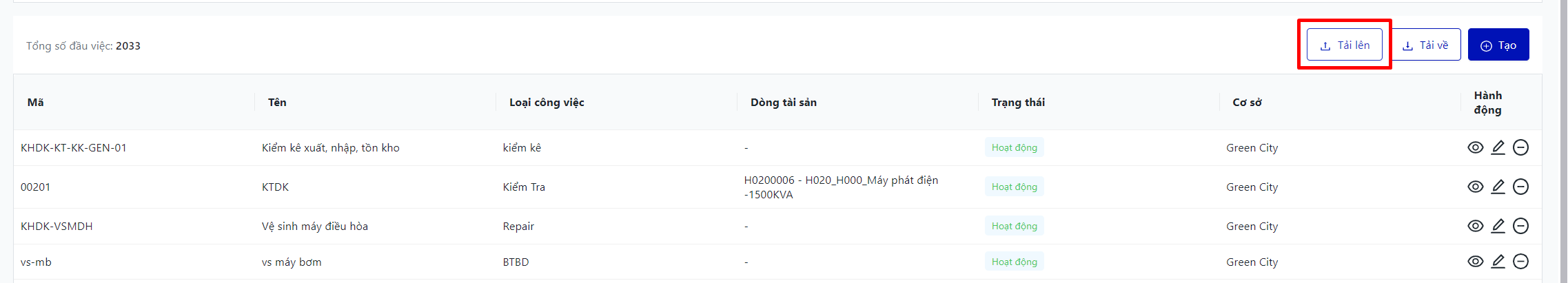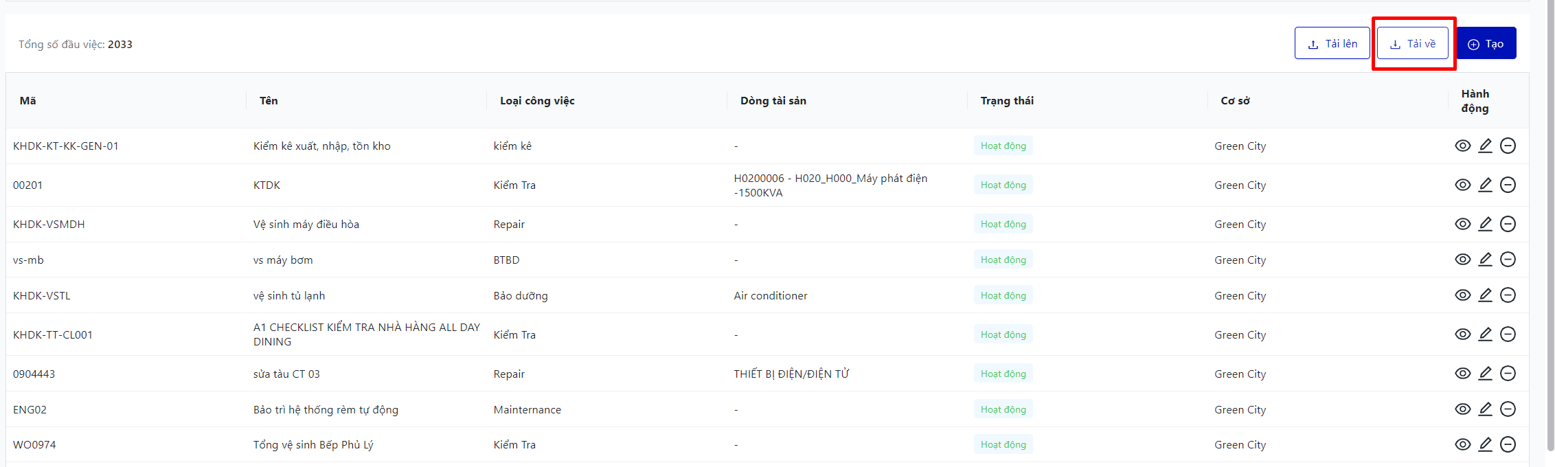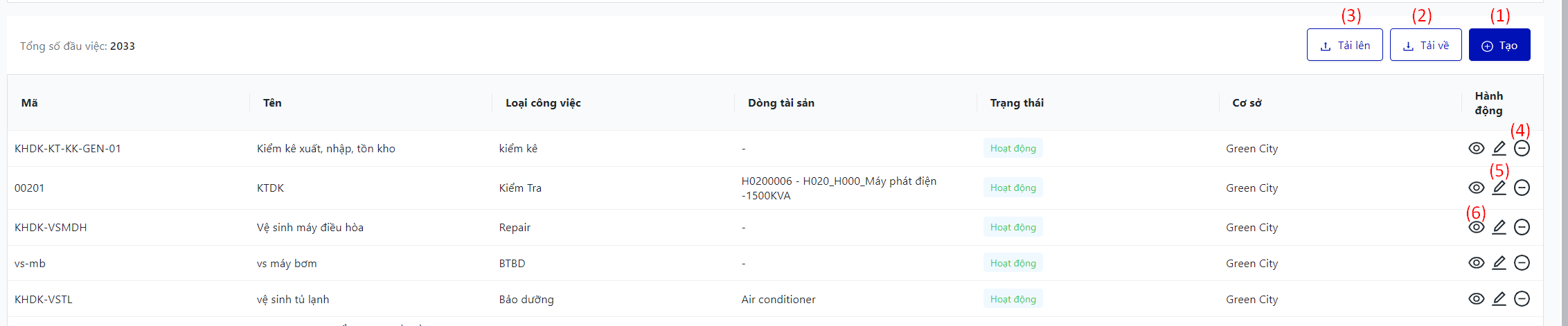 Màn hình hiển thị toàn bộ danh sách danh mục công việc của cơ sở |