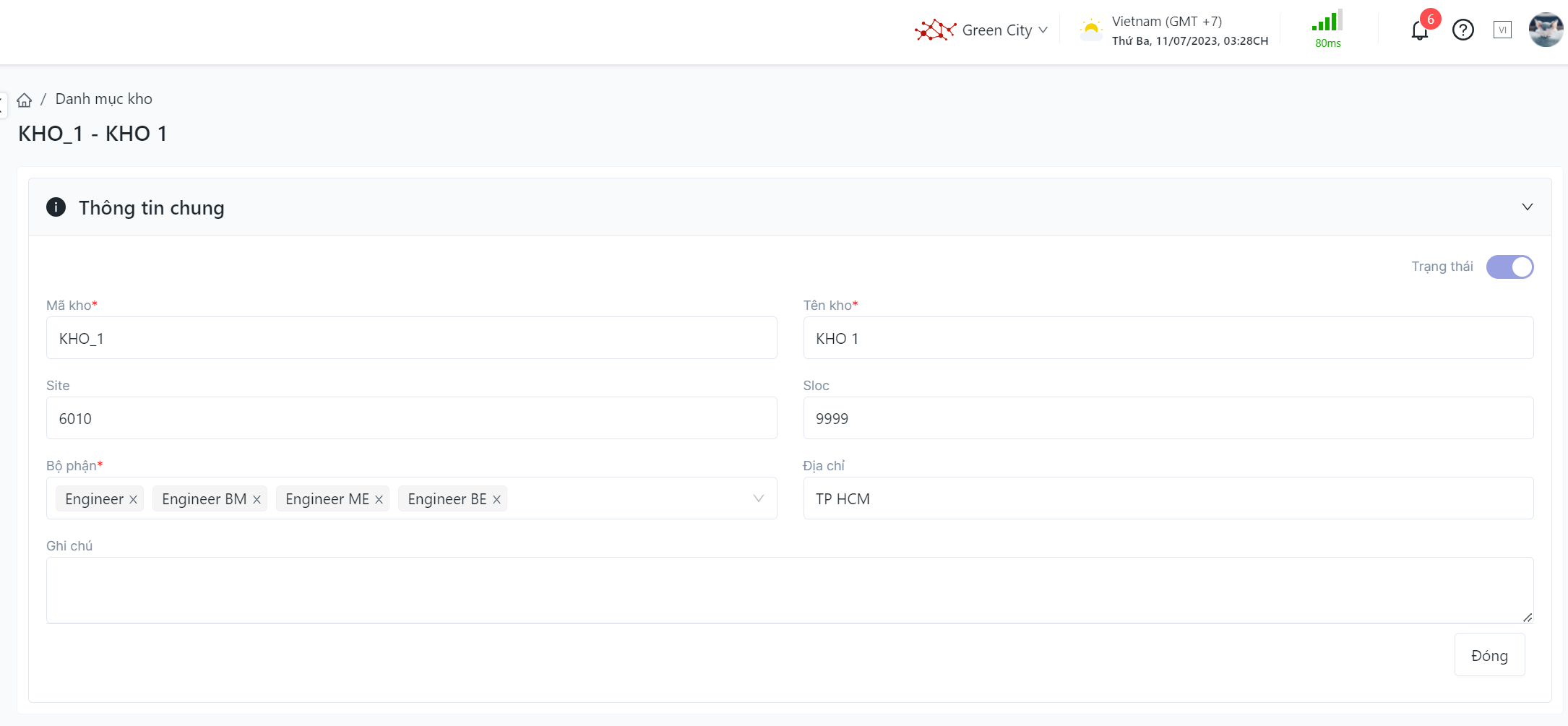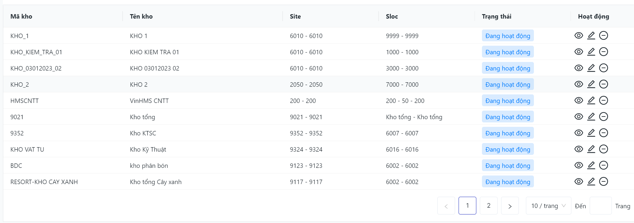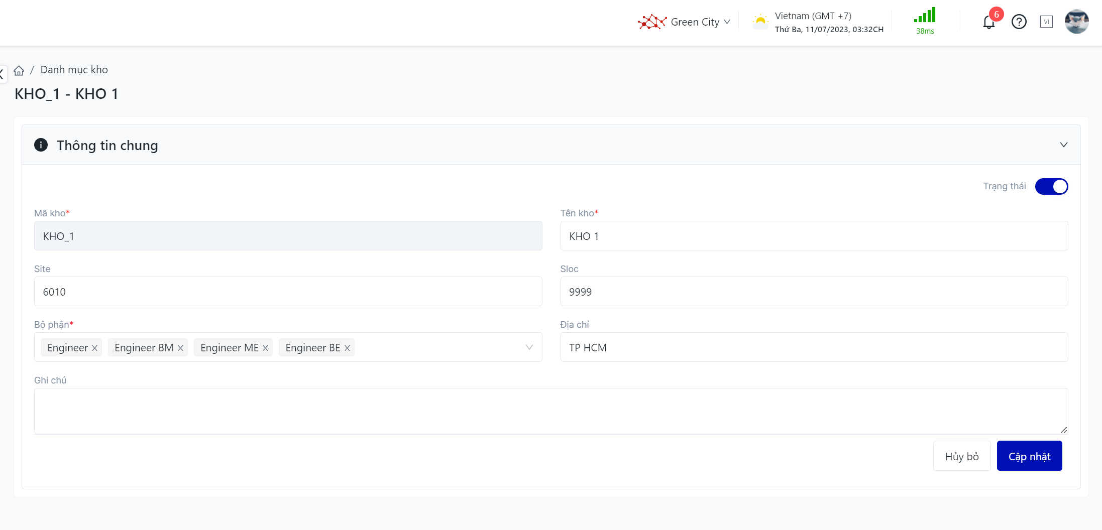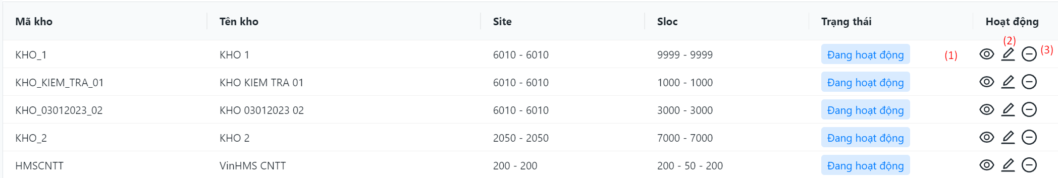 (1) Xem chi tiết các thông tin có trong 1 kho vật tư: ![]() (2) Chỉnh sửa các thông tin có trong 1 kho vật tư: dùng để chỉnh sửa thông tin của kho vật tư như tên kho, site, sloc, bộ phận, địa chỉ. ![]()
