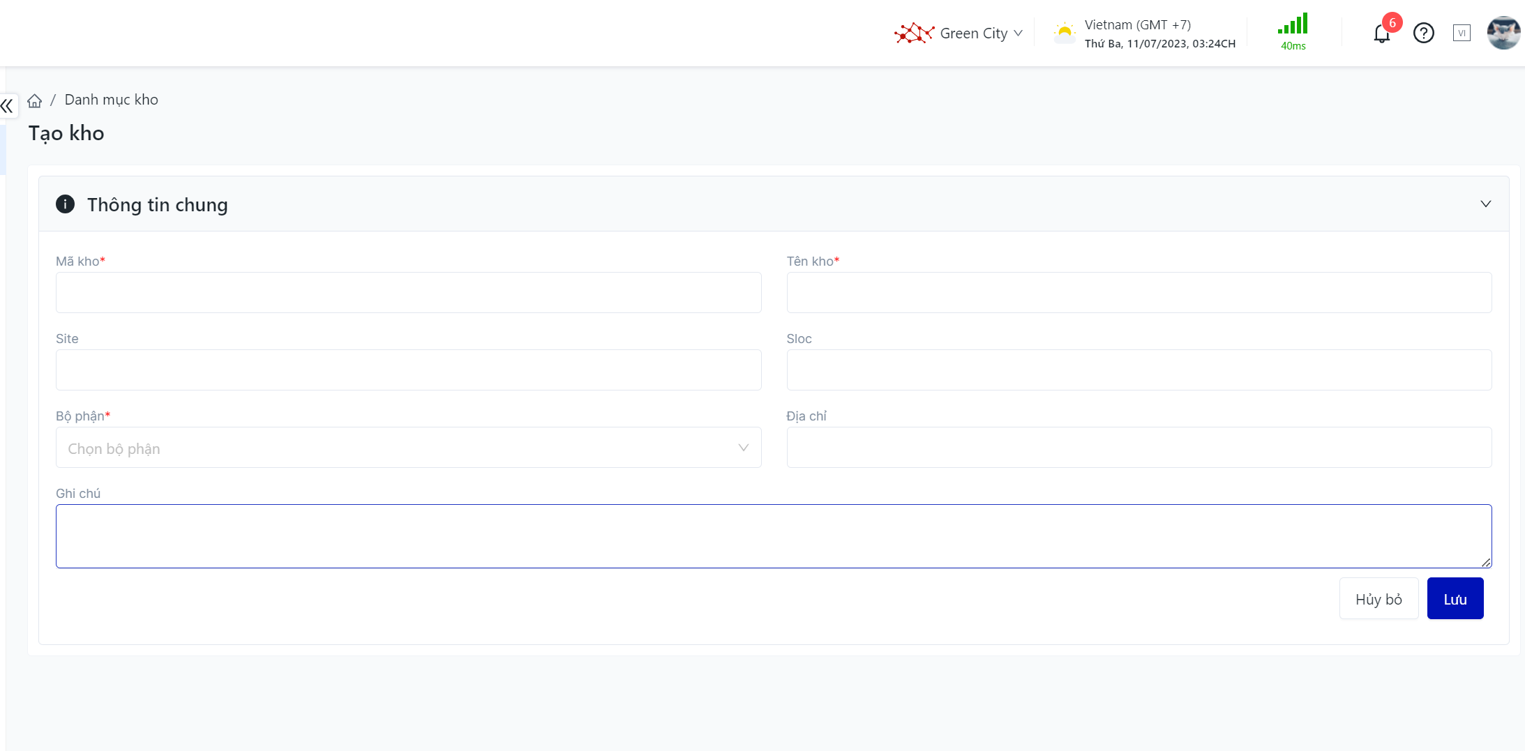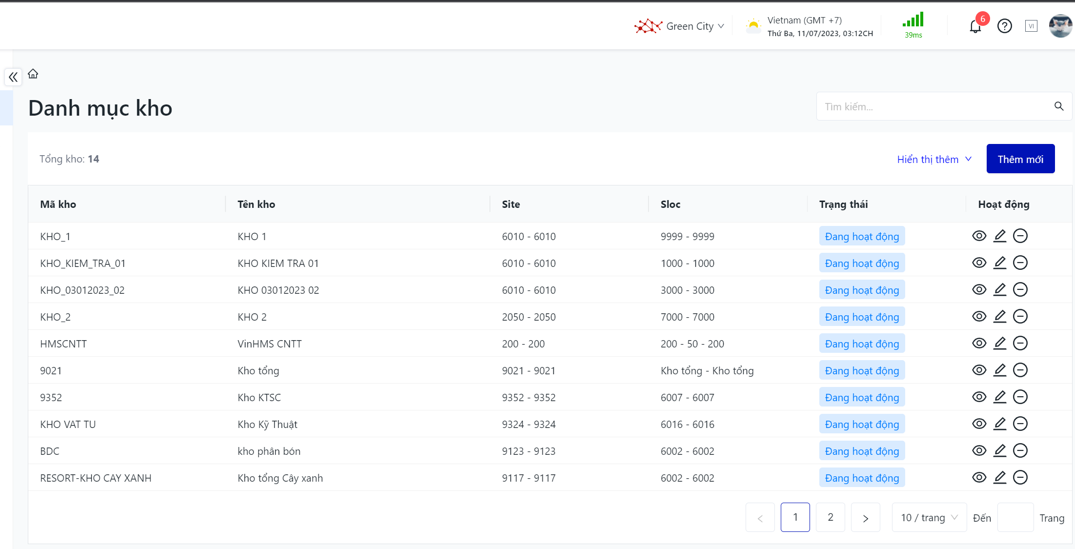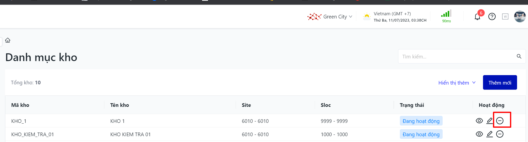 (1) Xem chi tiết các thông tin có trong 1 kho vật tư: ![]() (2) Chỉnh sửa các thông tin có trong 1 kho vật tư: dùng để chỉnh sửa thông tin của kho vật tư như tên kho, site, sloc, bộ phận, địa chỉ. ![]()