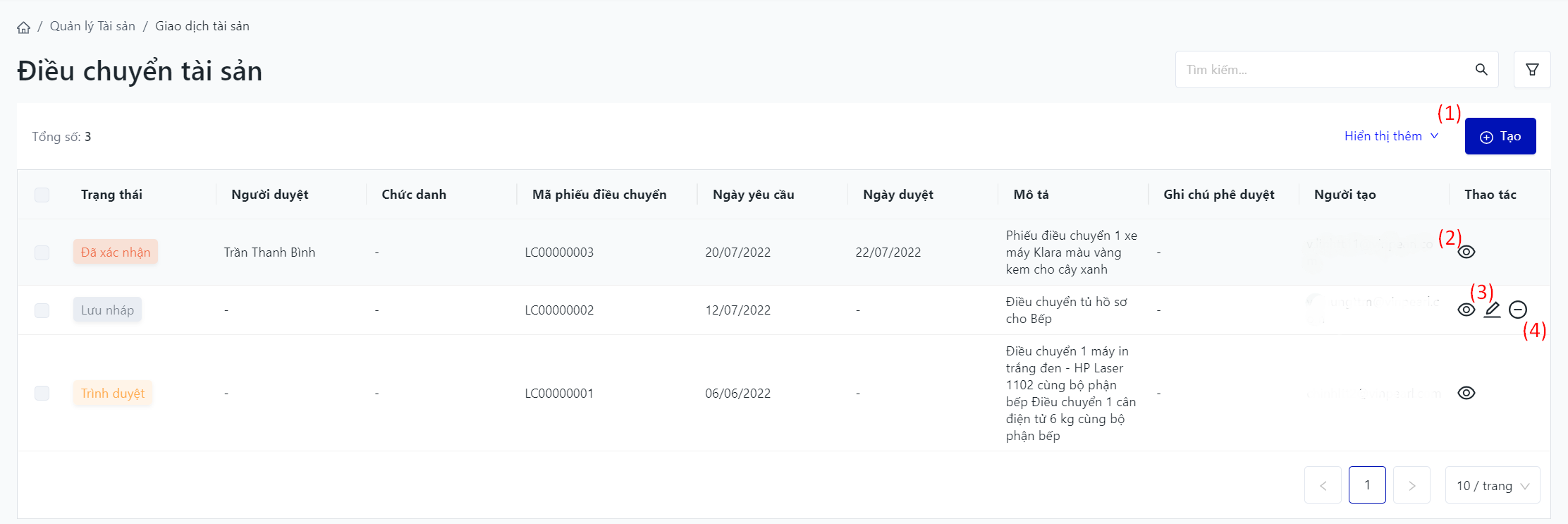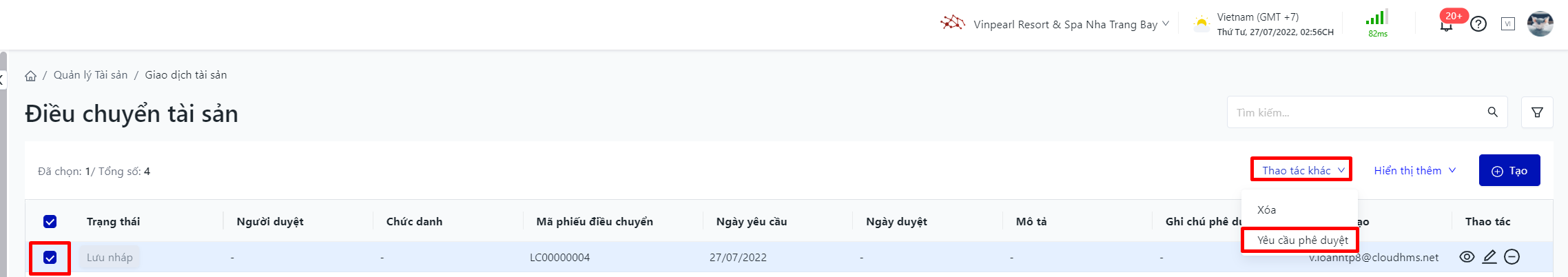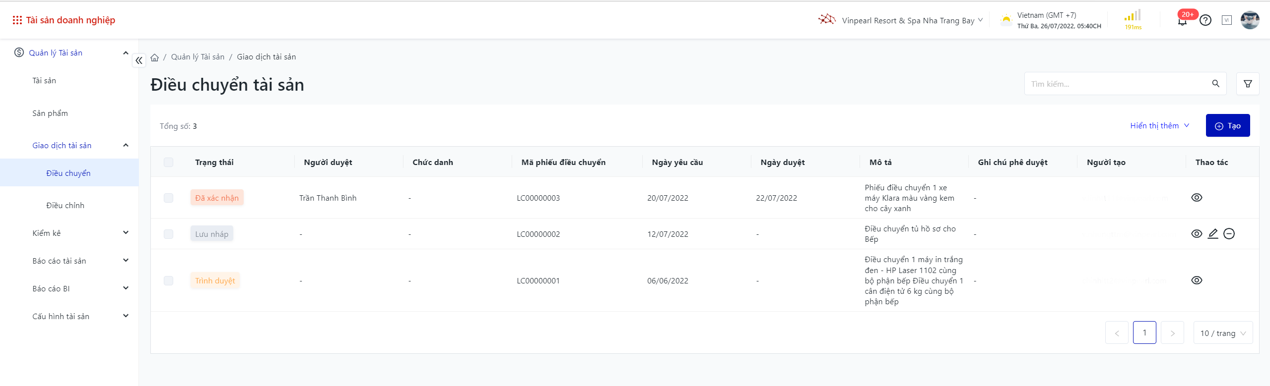 Đăng nhập – Tài sản doanh nghiệp – Giao dịch tài sản – Điều chuyển |